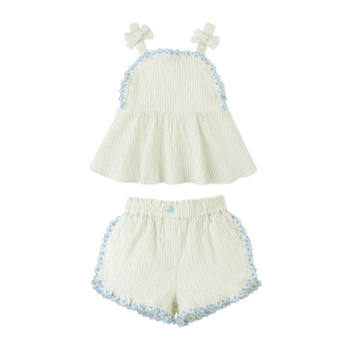 Blue/white 2pc set with scalloped, embroidered ruffles throughout. adjustable bow straps and elastic waist shorts.