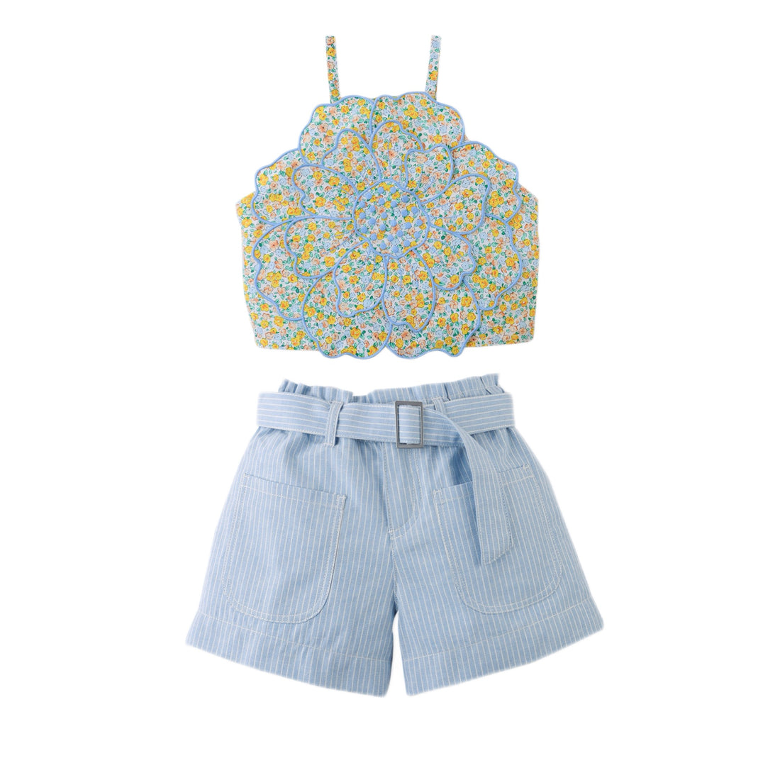 Floral halter top with statement flower appliqué, styled with chic striped shorts in a linen-like...