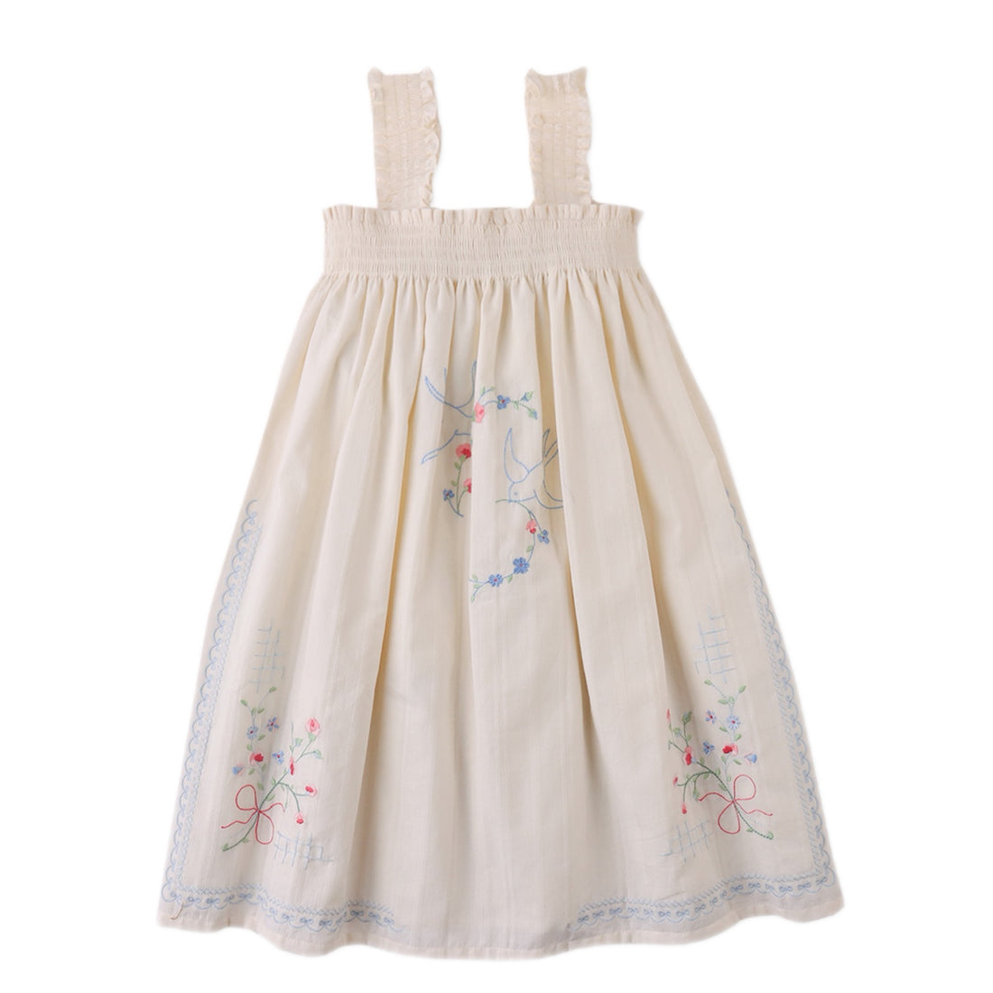 Ivory swing dress adorned with delicate embroidered flowers and birds. Designed with a flowing silhouette...
