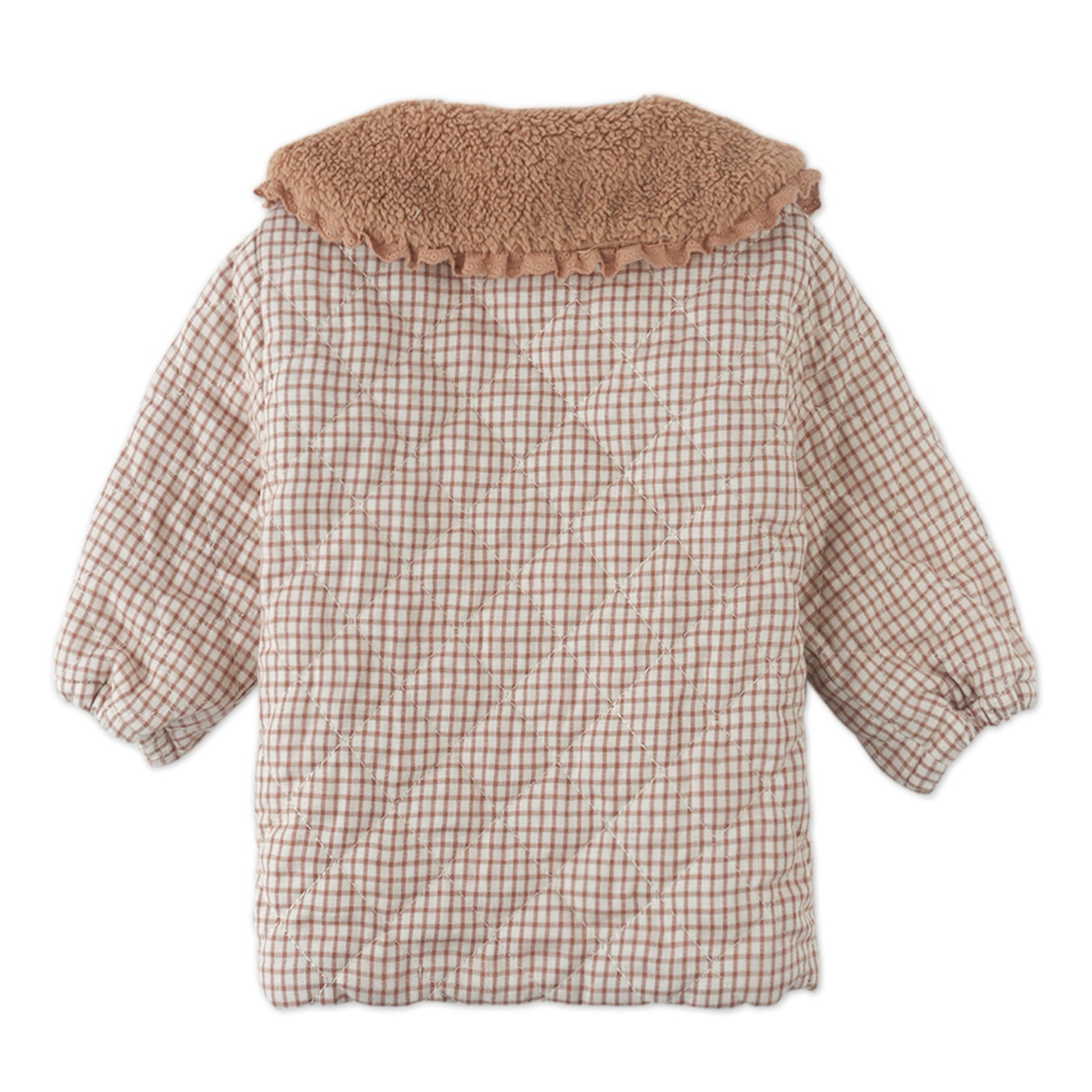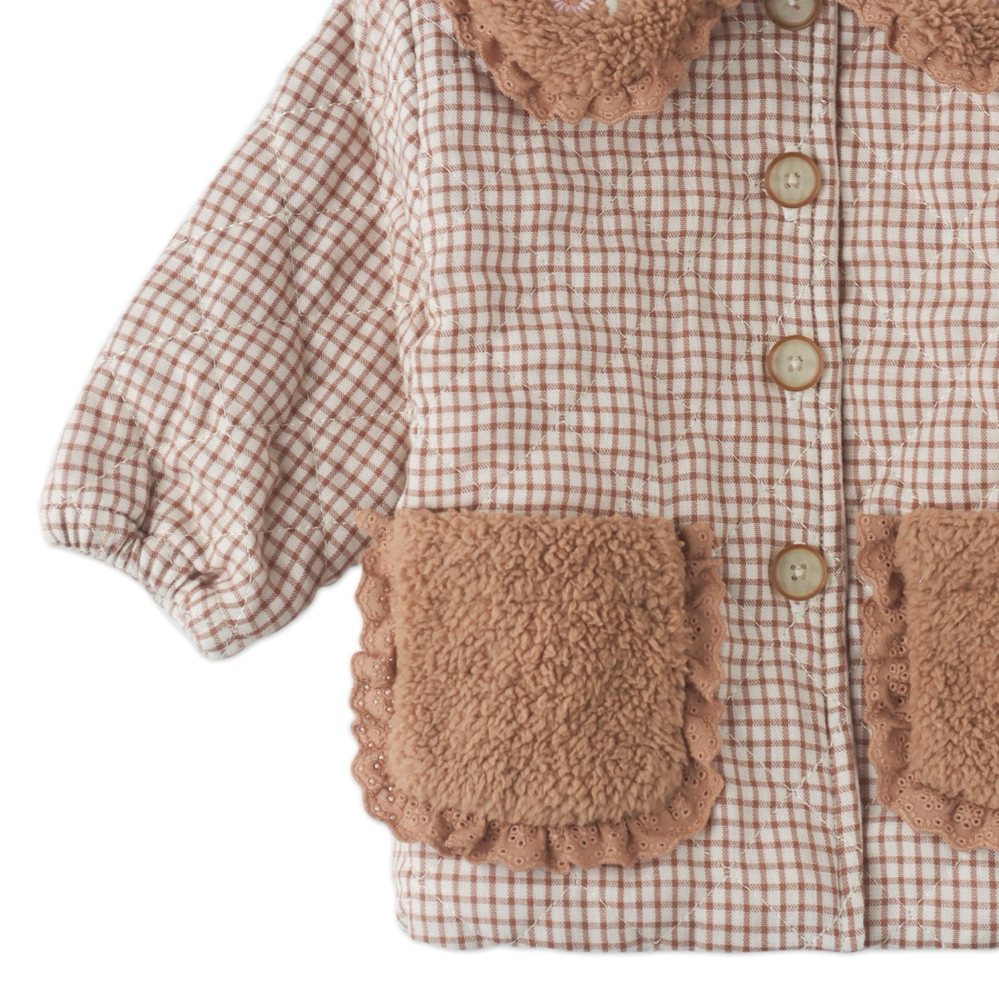 Quilted teddy jacket with all of the feminine details you love! The eyelet ruffle trim and floral embroidery on the collar make this a favorite!