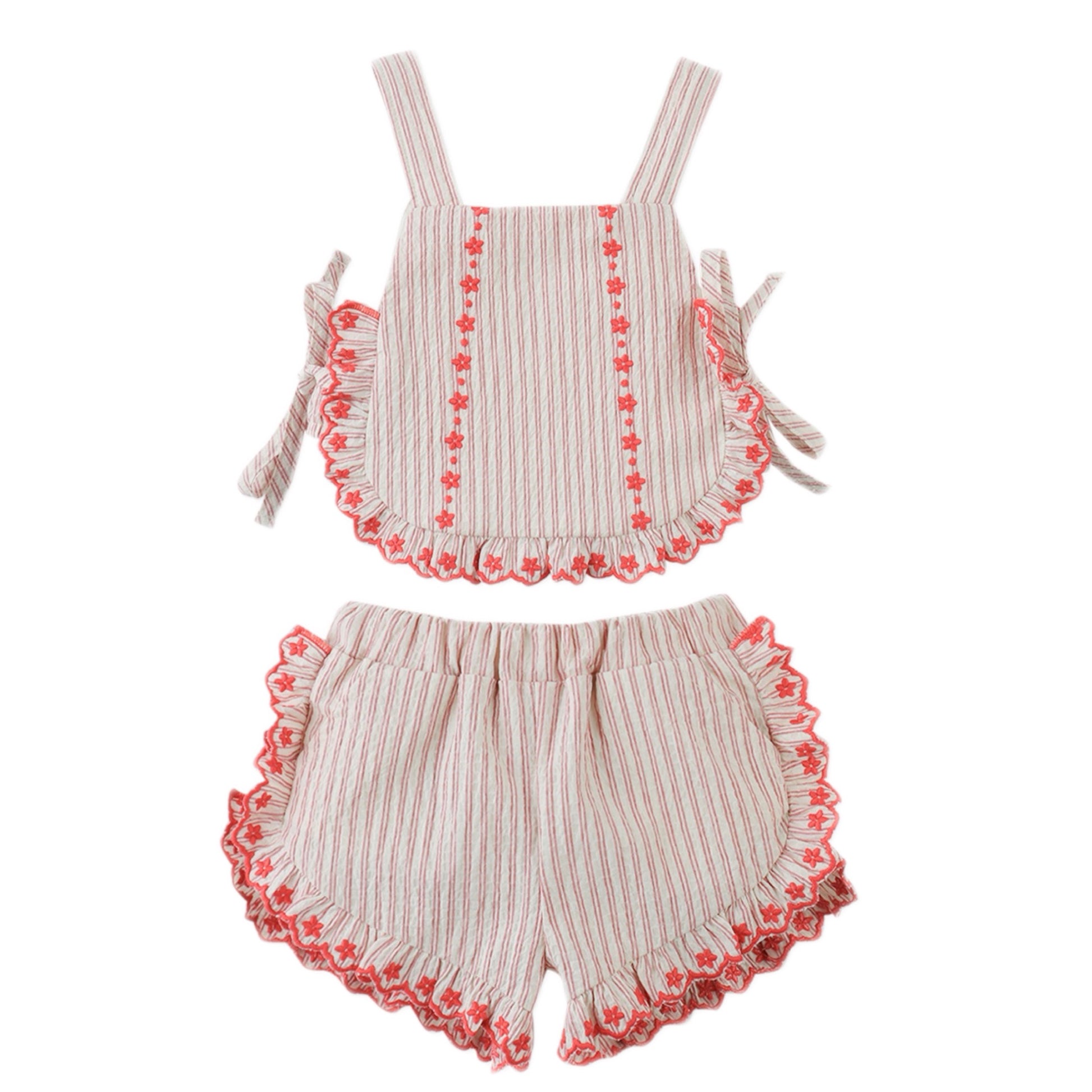 Coral/white baby set with all the details! Embroidery, ruffles, scalloped edges and bows!