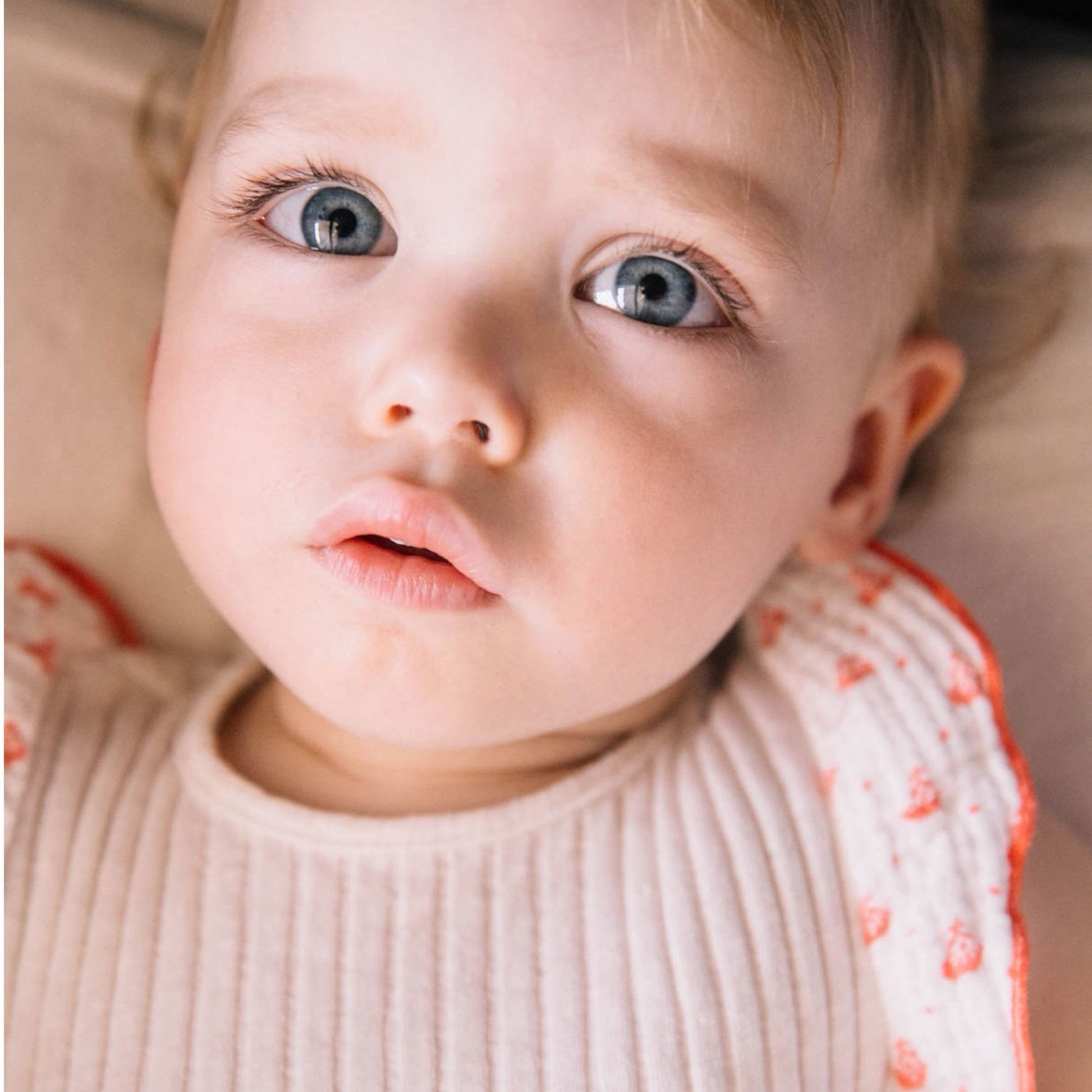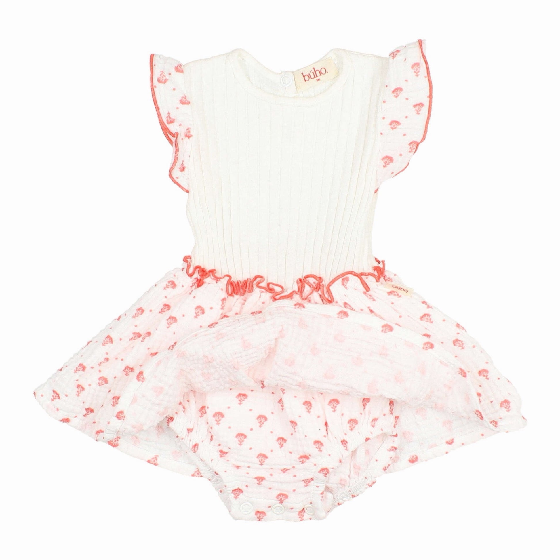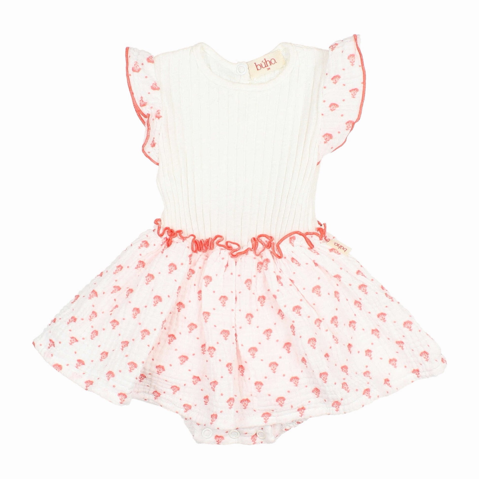 This sweet dress has a white rib base, and a gauze skirt and sleeves in a coral floral print. Attached diaper cover with bottom snaps makes for easy diaper changes.