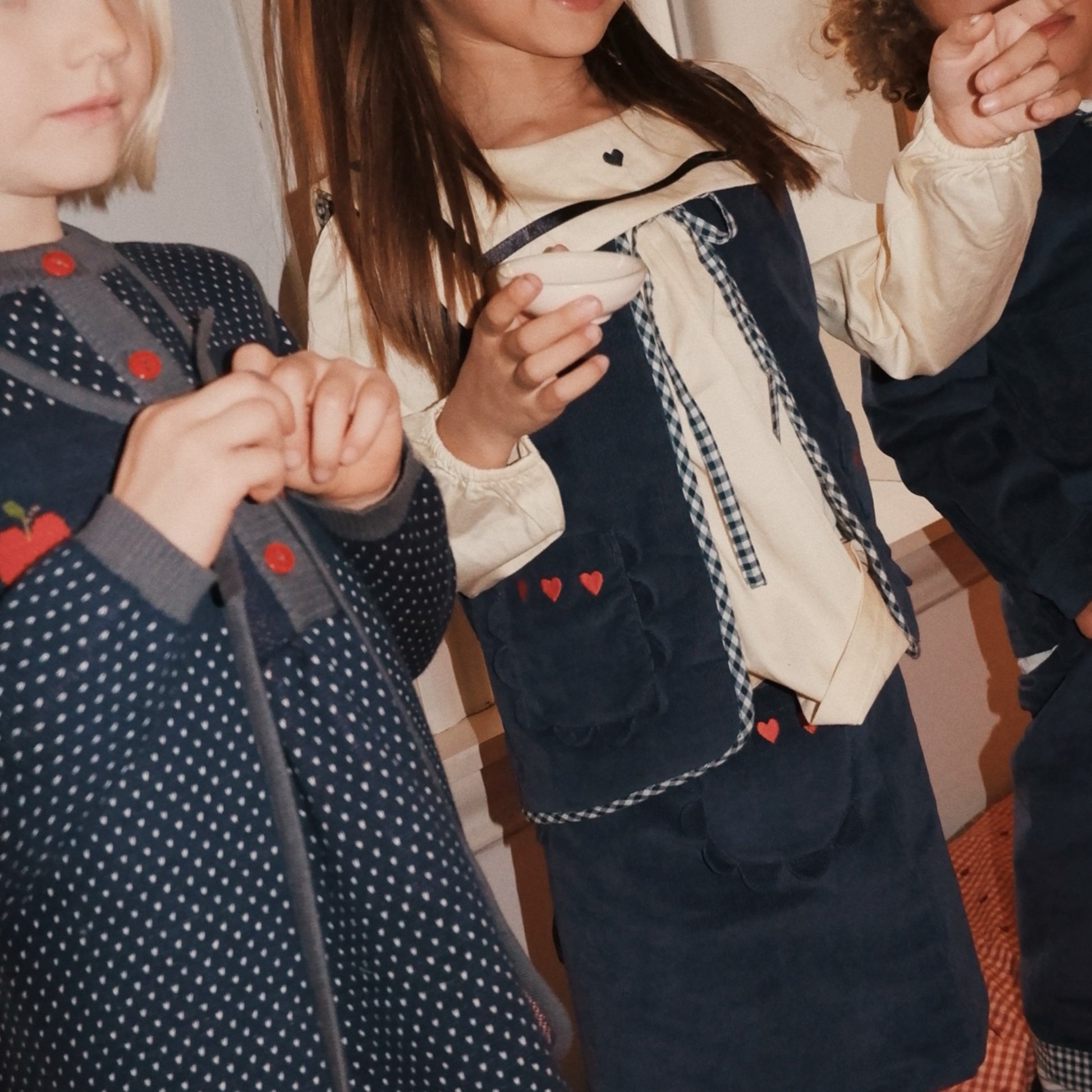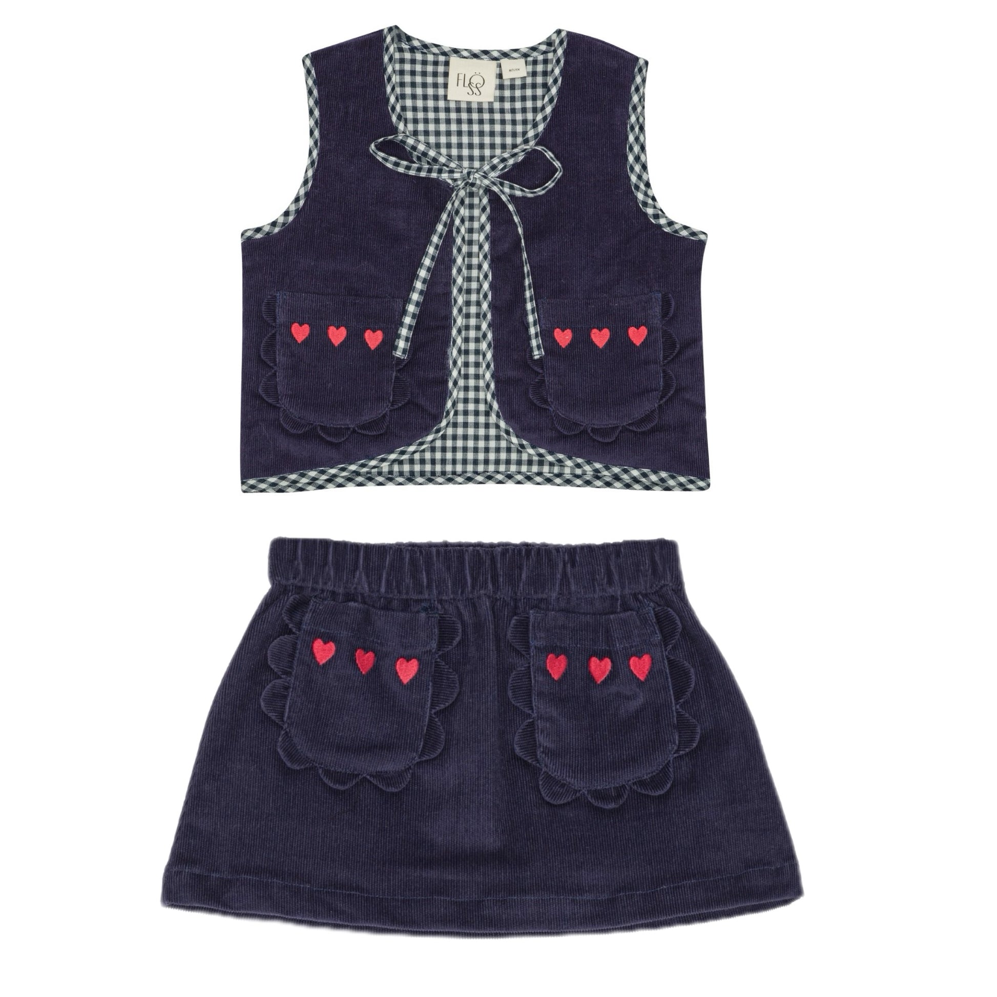 Fine navy corduroy skirt with scallop trimmed pockets and heart embroidery. Skirt has adjustable waist for perfect fit. Puffy vest with gingham detail to complete the look.