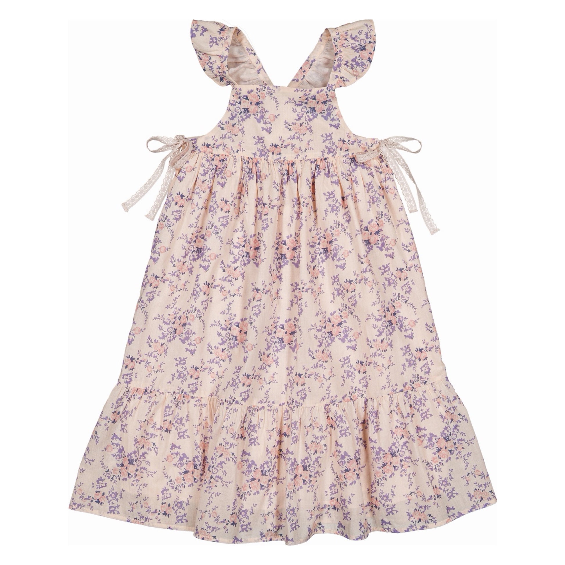 The Caitlin Dress is a Pink Mauve floral maxi style, with ruffled straps and side ties. This classic silhouette is feminine, flirty, and oh so French.