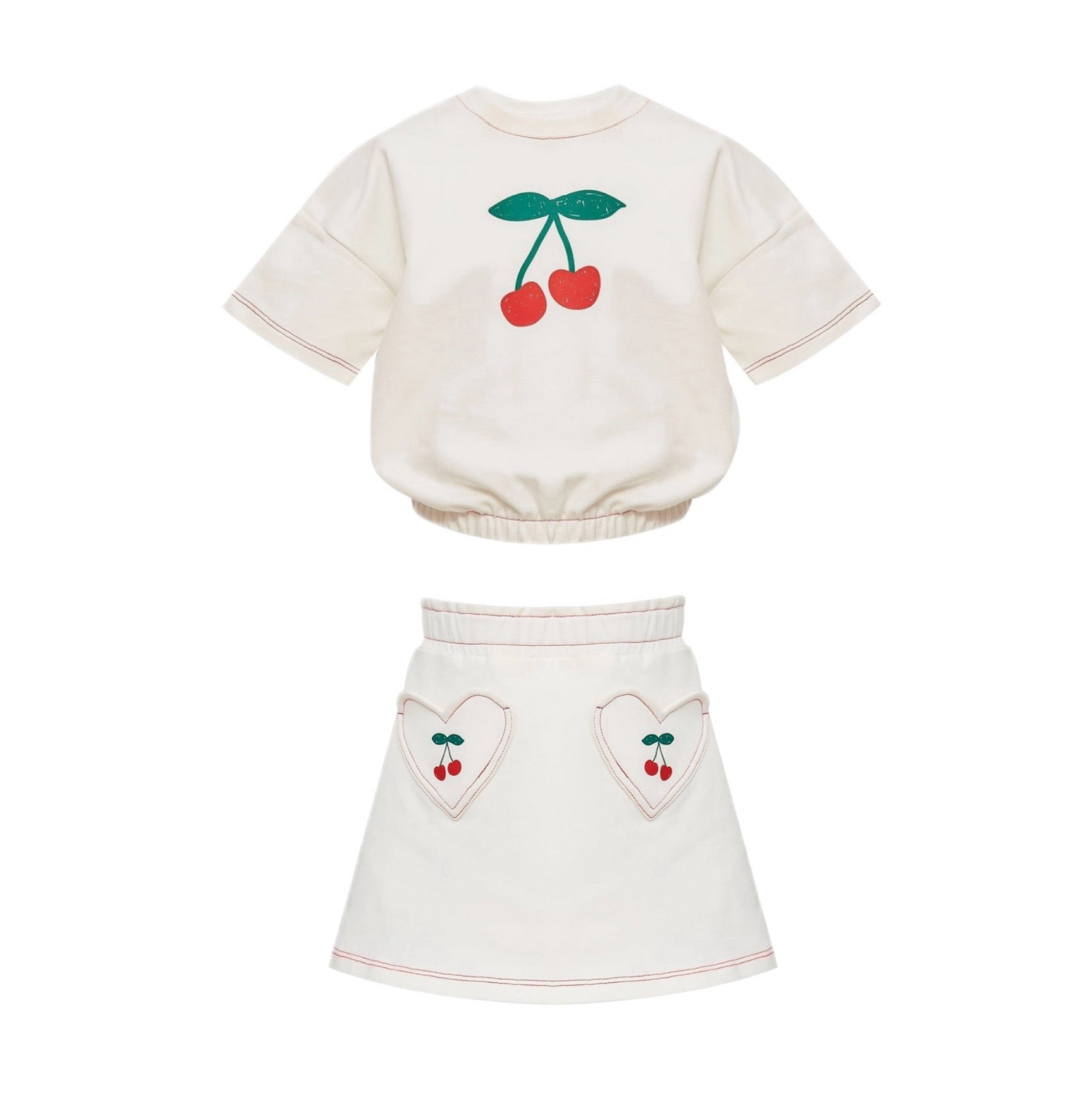Fresh white organic cotton set with cherry decals. Blousy fit t-shirt with gathered waist, paired with an a-line skirt with heart pockets. Elastic waist. This is a must-have closet staple!
