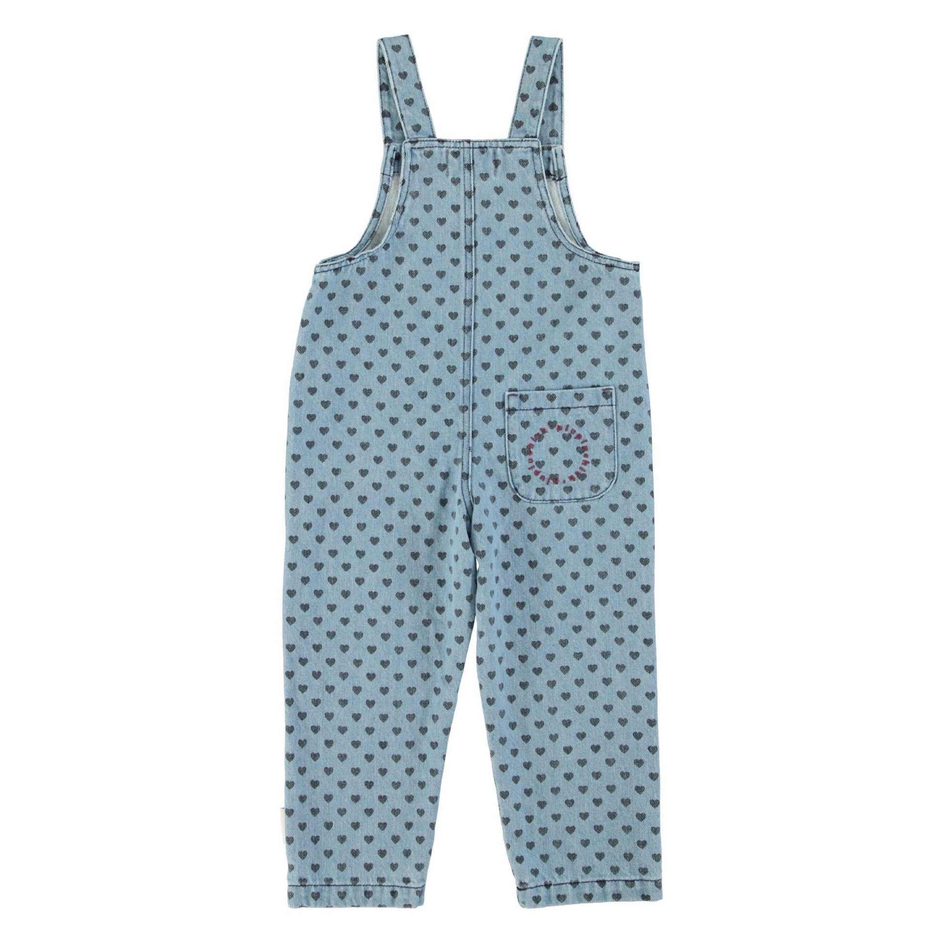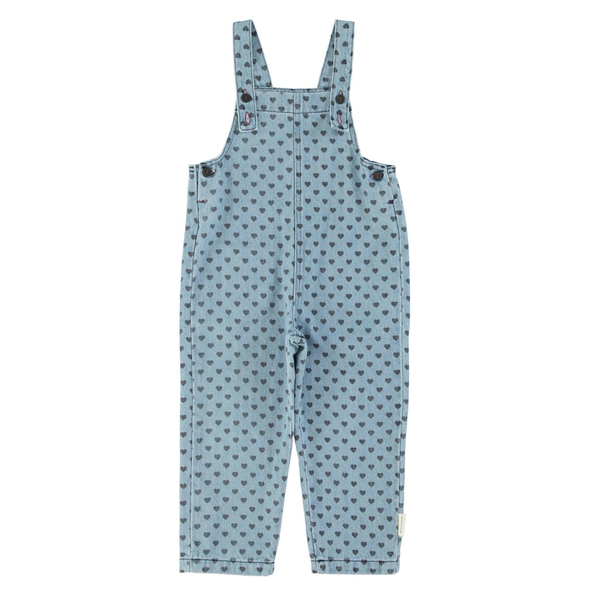 Overalls in washed blue denim with black hearts. Adjustable strap button to allow room for growth.