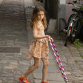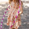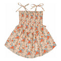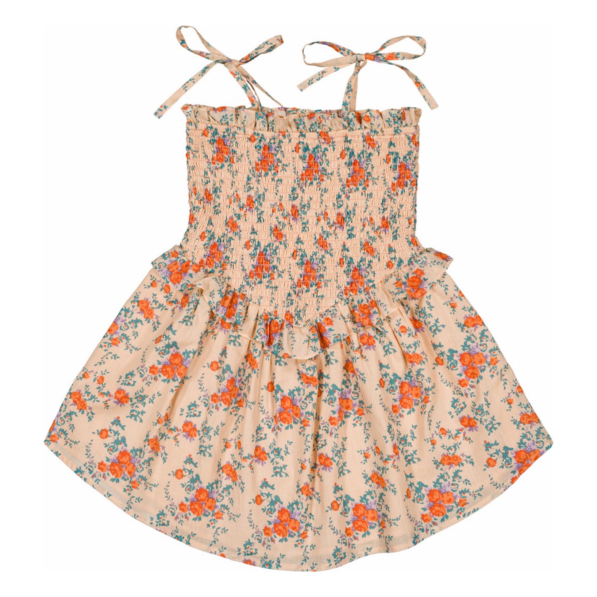 The Eden Dress in nude/orange floral has a v-waisted smocked bodice finished with ruffles, a flounce skirt that is slightly longer in the center and shorter on the sides, and adjustable tie straps. We love the 80s vibe if this new silhouette from Louis Louise.