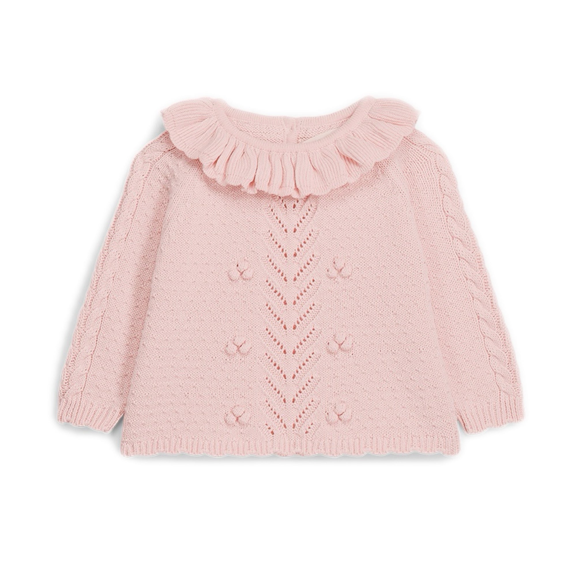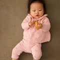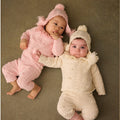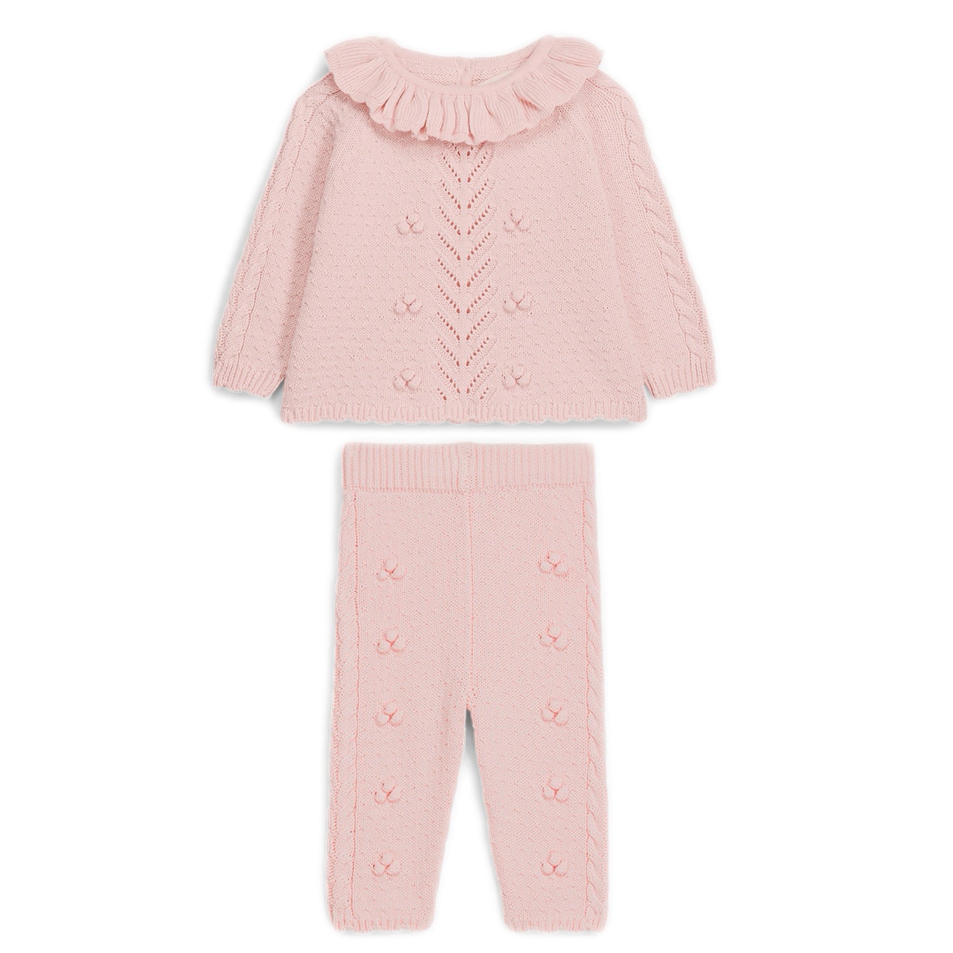 100% cotton knit set in blush pink. Whimsical and classic, perfect for your little doll.