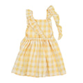 This set has us dreaming of sunny summer days... Gingham Bikini in Sun, paired back to the Gingham apron style dress in sun. The bikini features a smocked top and a side tie bottom with a ruffle detail. The dress has adjustable back straps to allow more space as she grows.