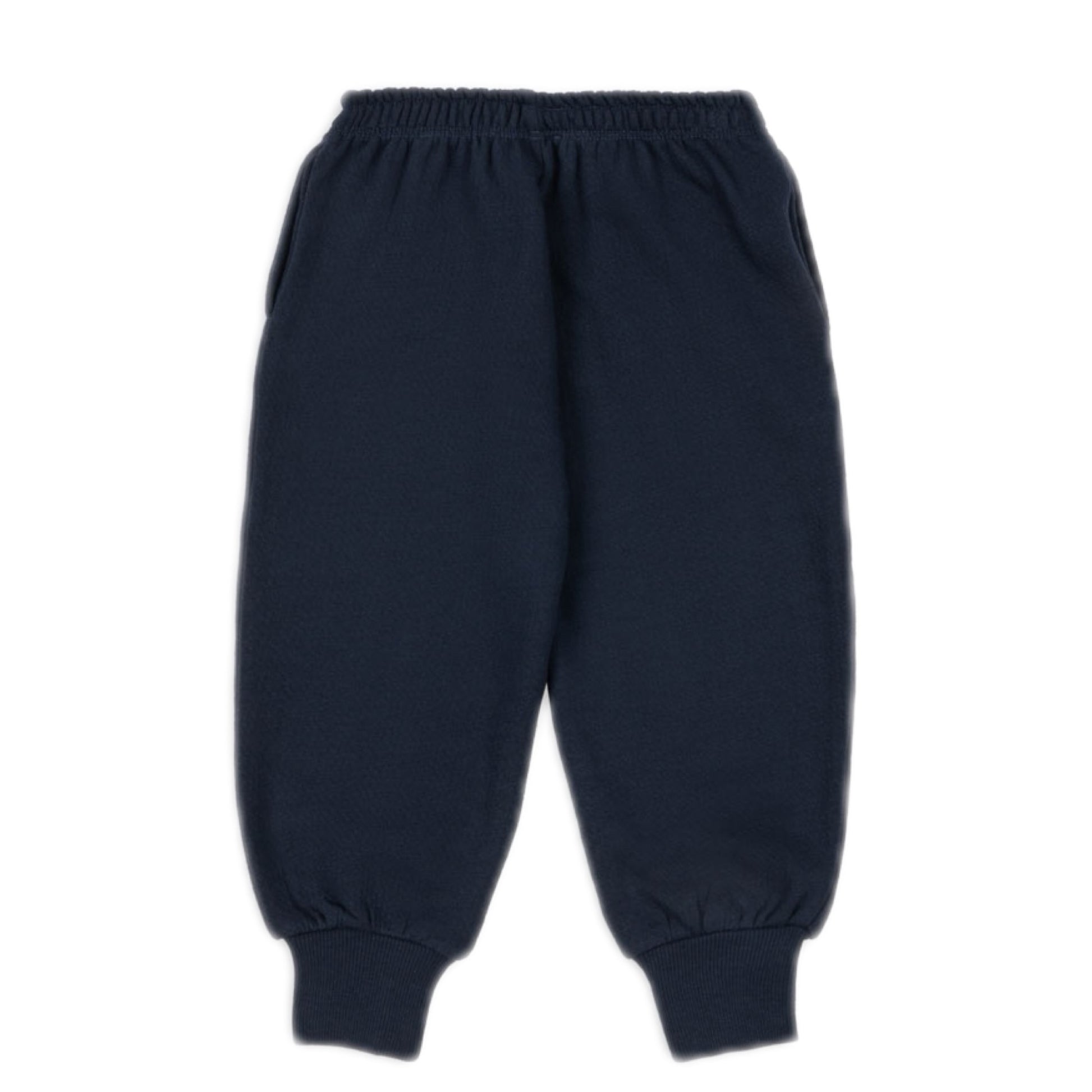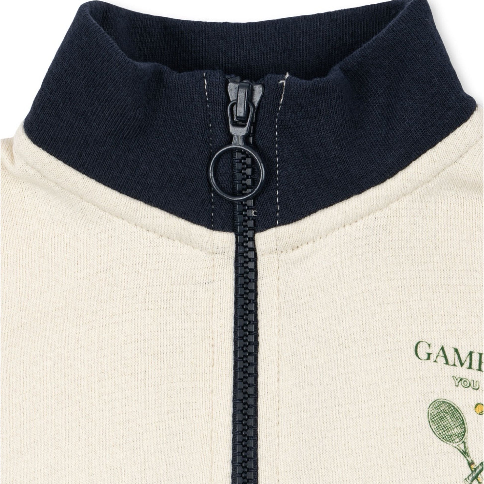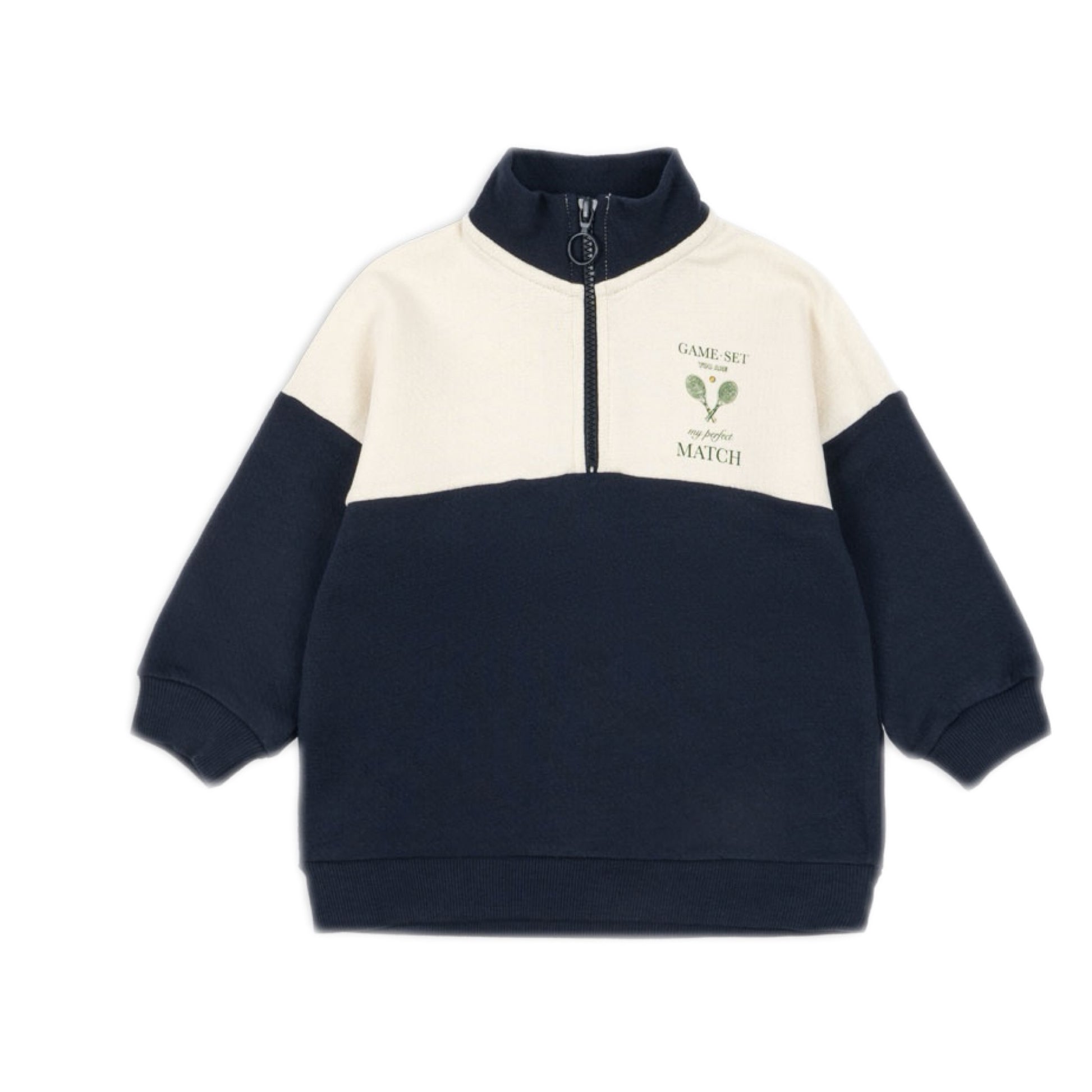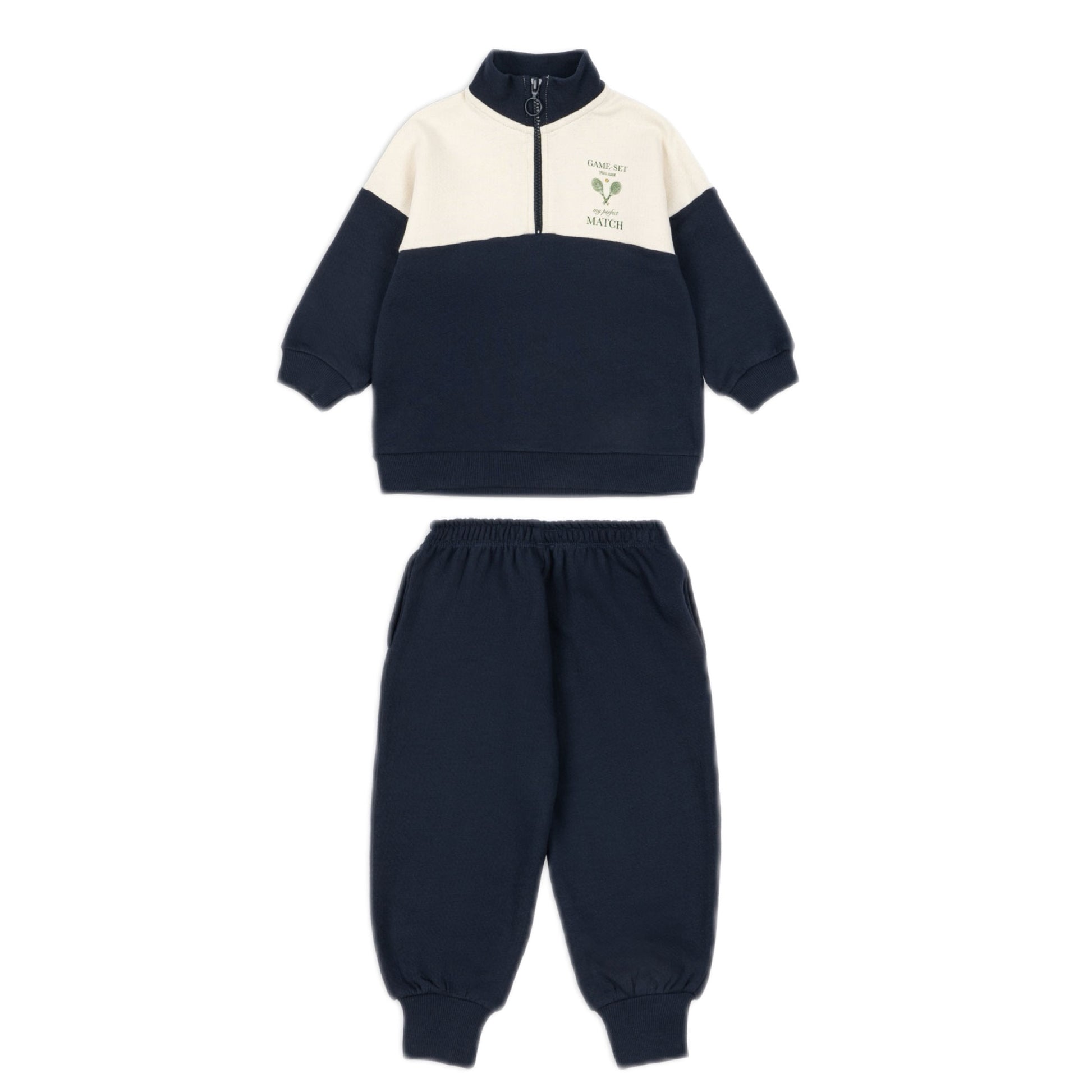 Organic cotton navy/ivory color block sweat set with a half-zip and tennis motif. Game, Set, Match!