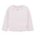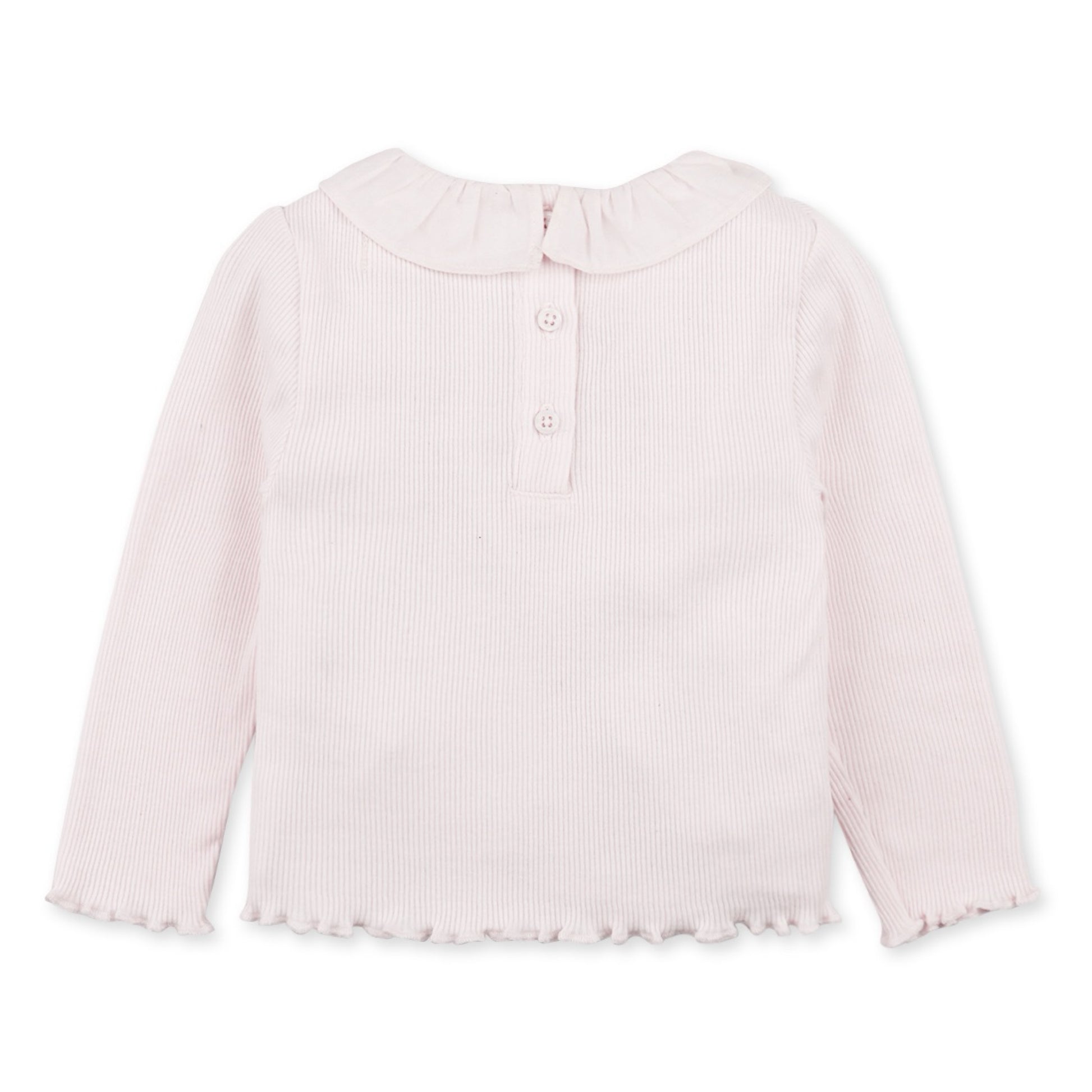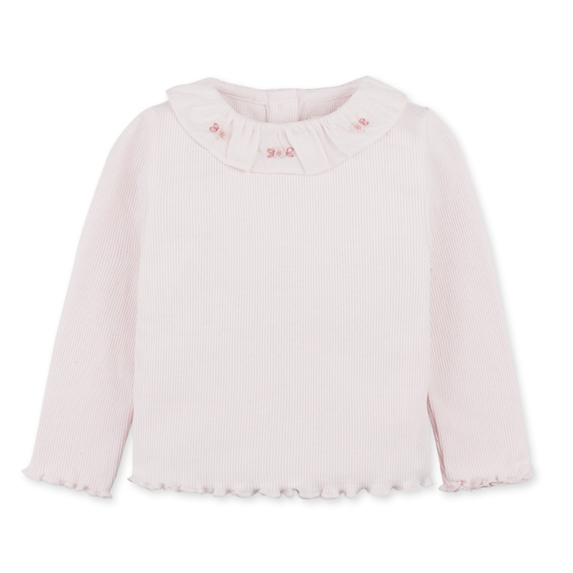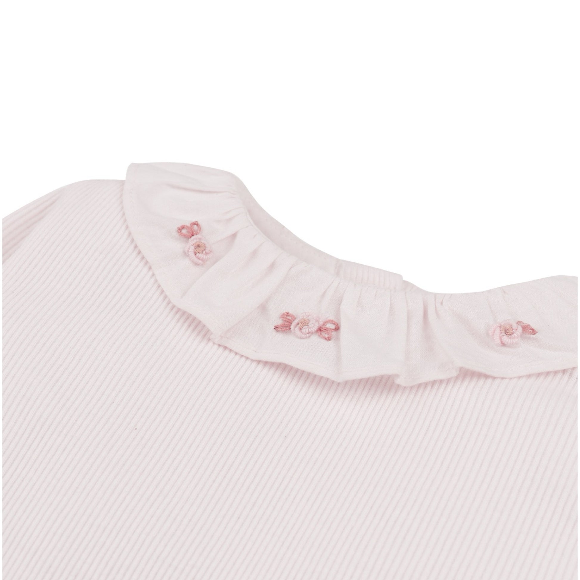 The perfect pale pink ribbed tee you've been looking for to layer for Fall. We love the floral detail on the collar.