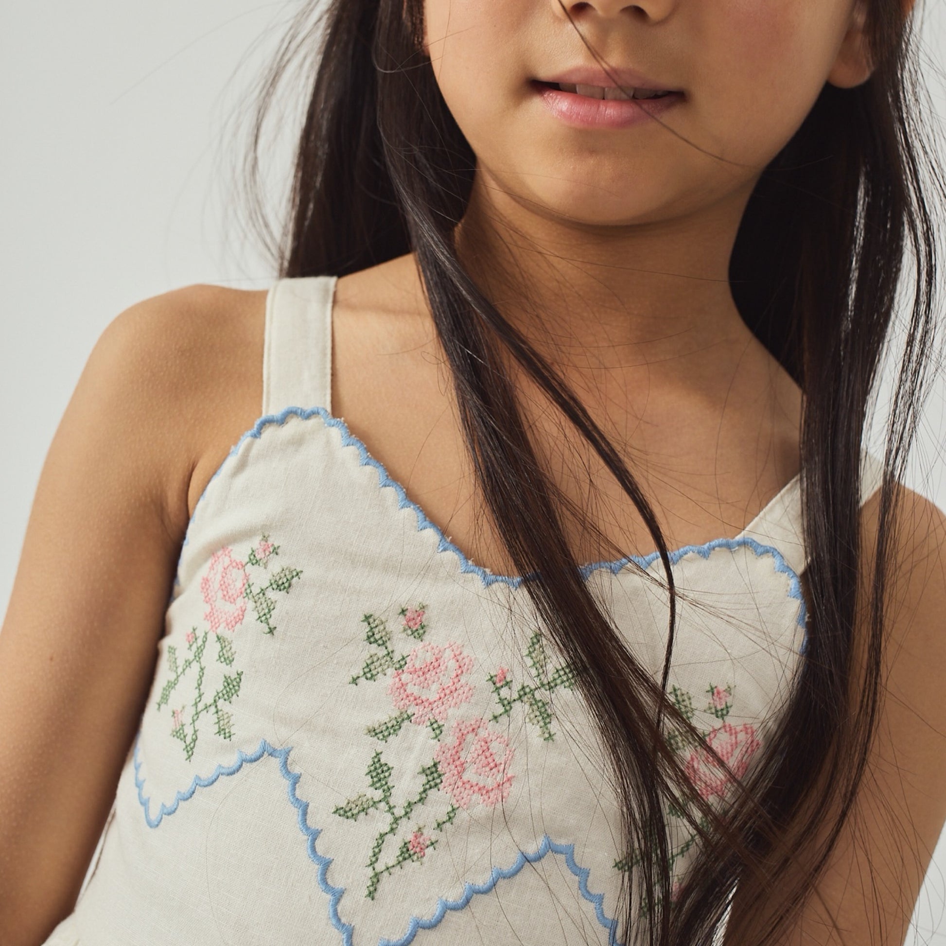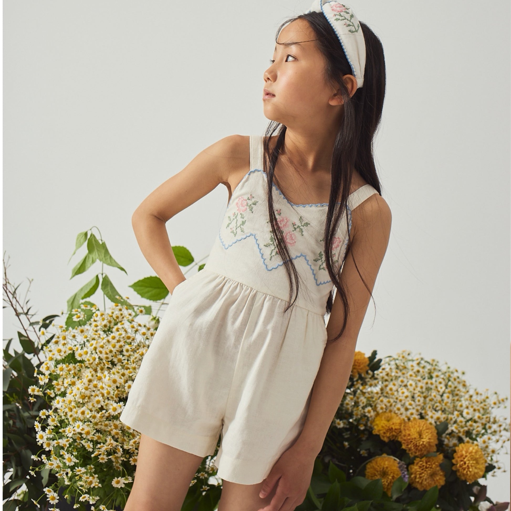 A beautifully crafted girls’ playsuit with an embroidered bib detail that elevates everyday dressing. Soft, breathable fabric and a playful silhouette make it both stylish and comfortable for all-day wear.
