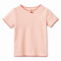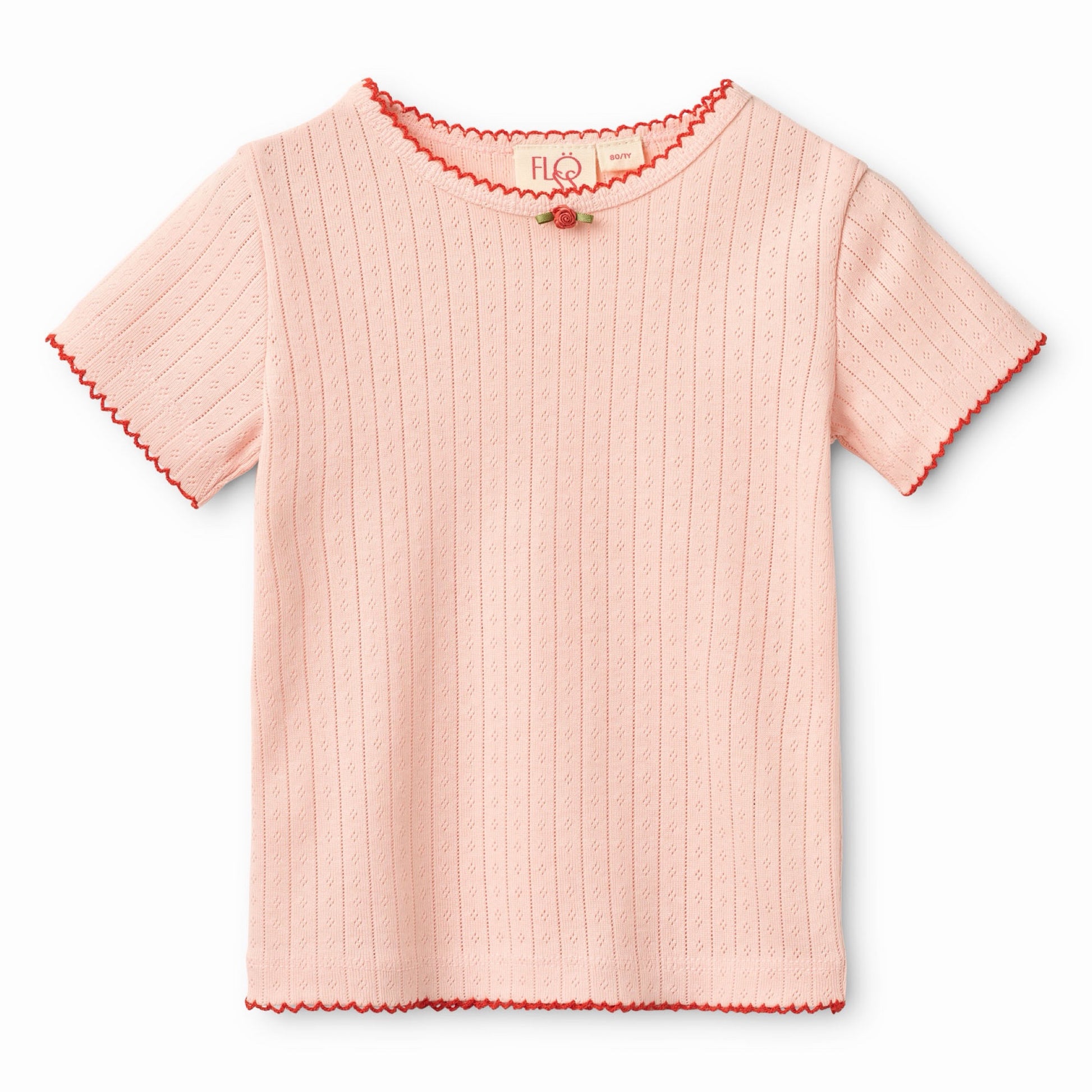 Cotton pointelle Tee in Soft Rose, with a red rosette detail on the collar, and contrasting red trim stitching. This tee pairs with the Liva Cardigan, Liva Legging, or Elina Skirt for a complete look.