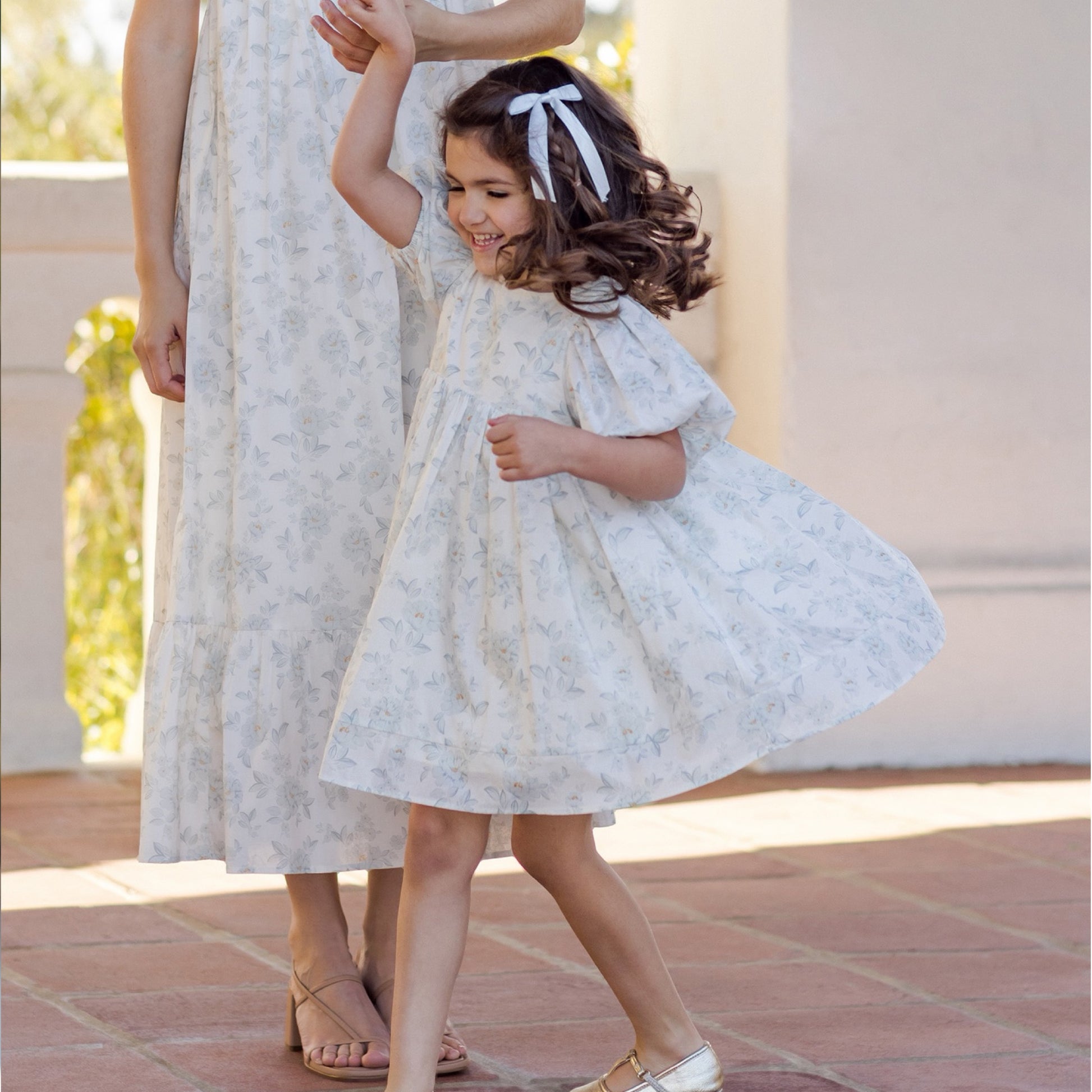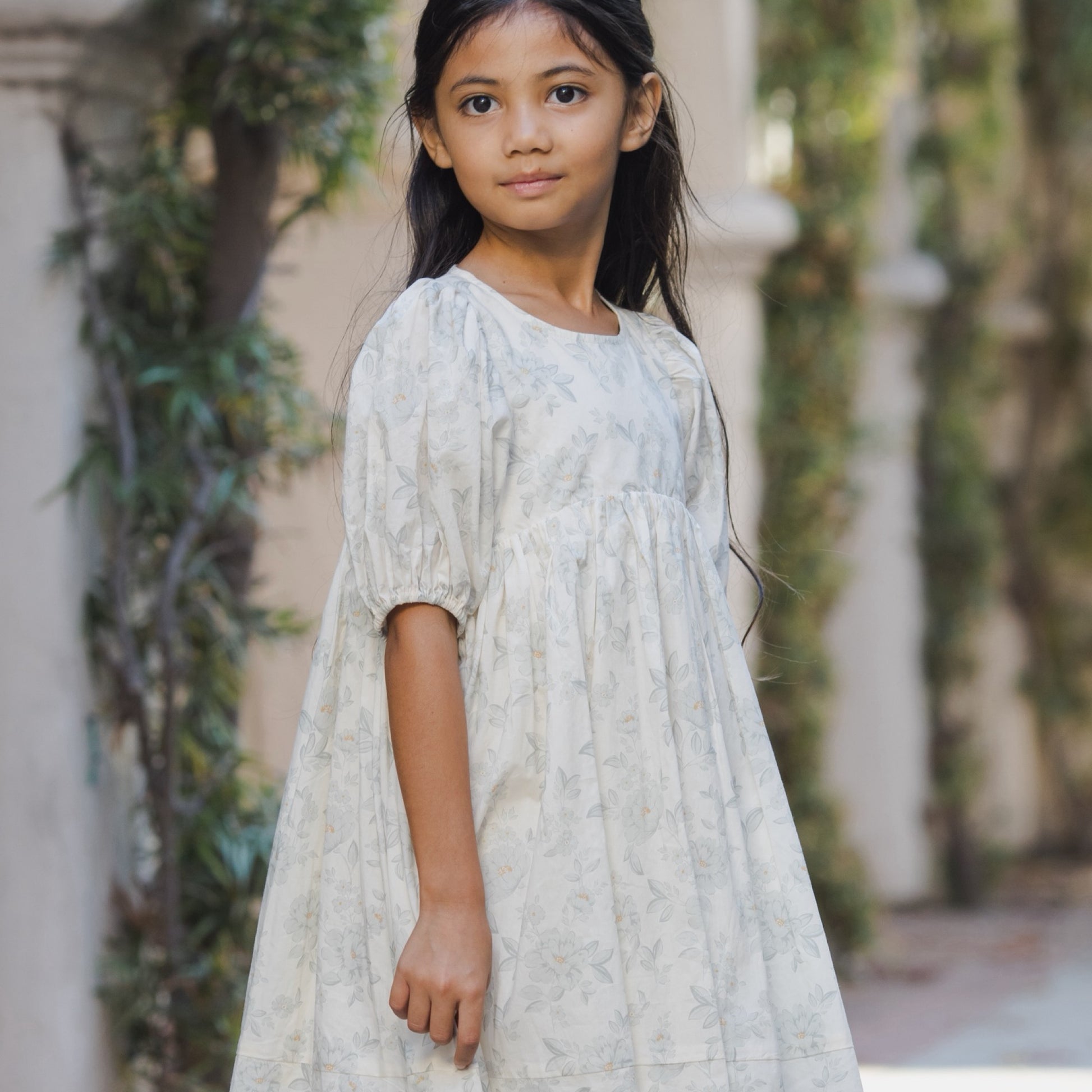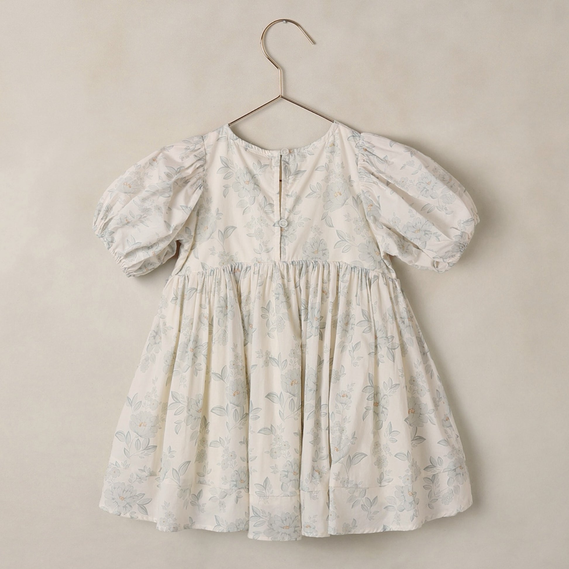 The Luna Dress features a babydoll inspired silhouette with pretty puff sleeves and a curved waistline. Cool blues and faded greens make this rose print perfect for spring.