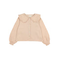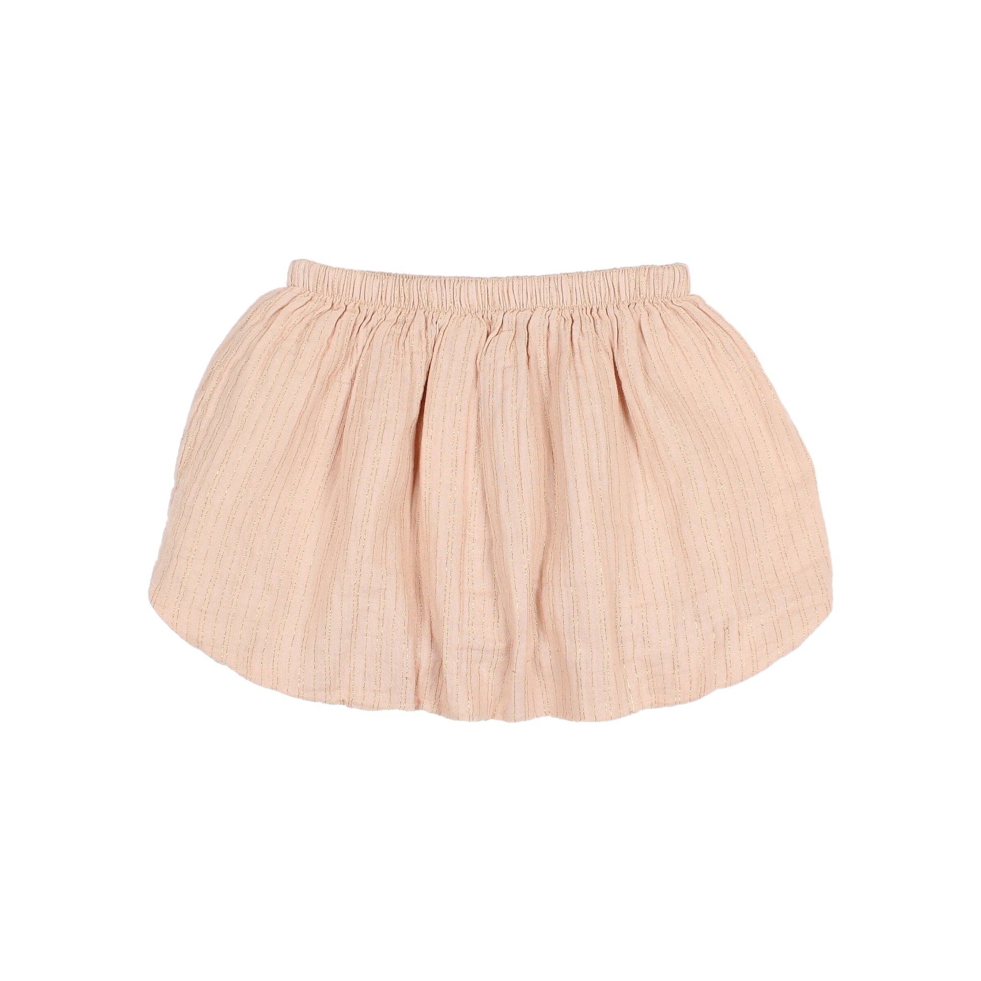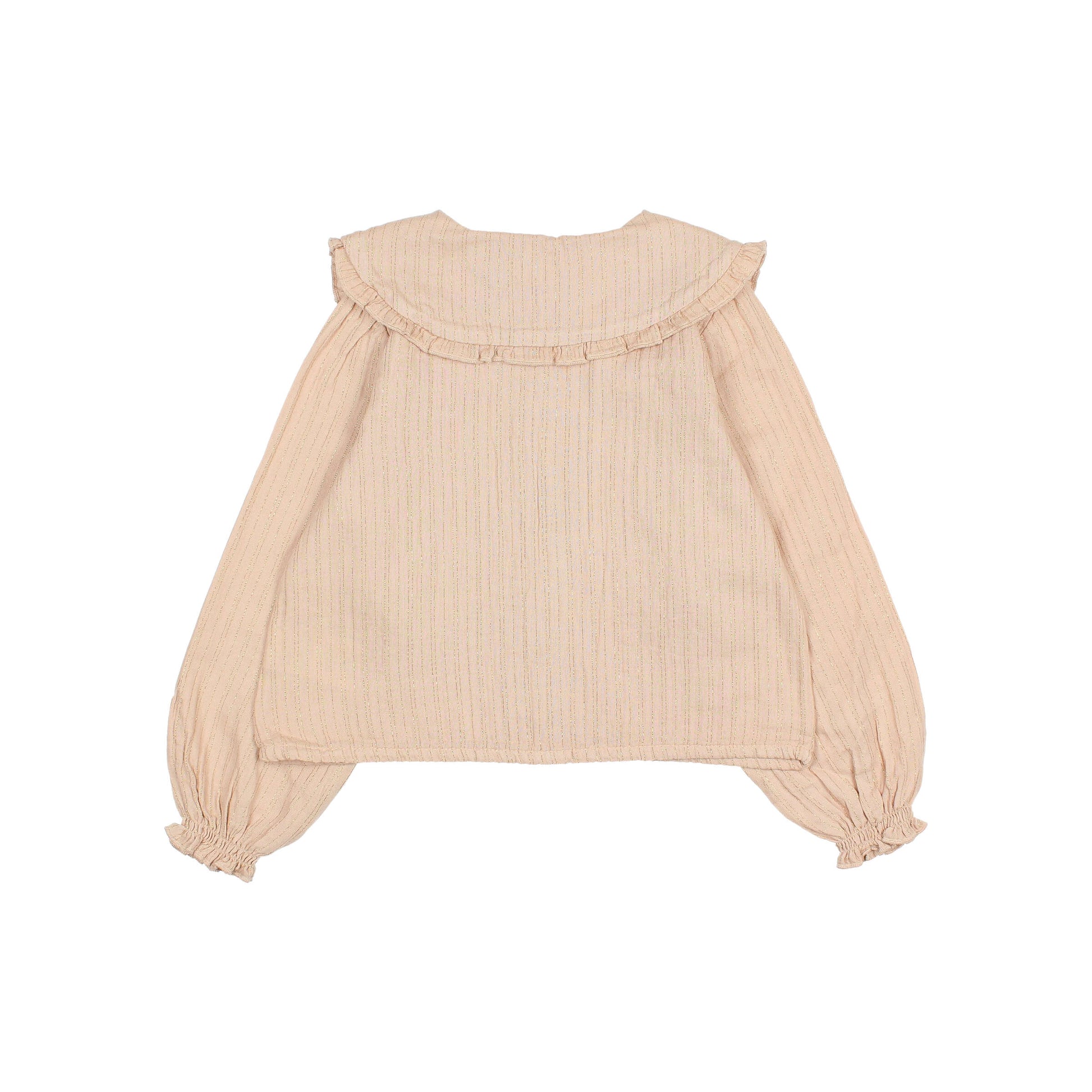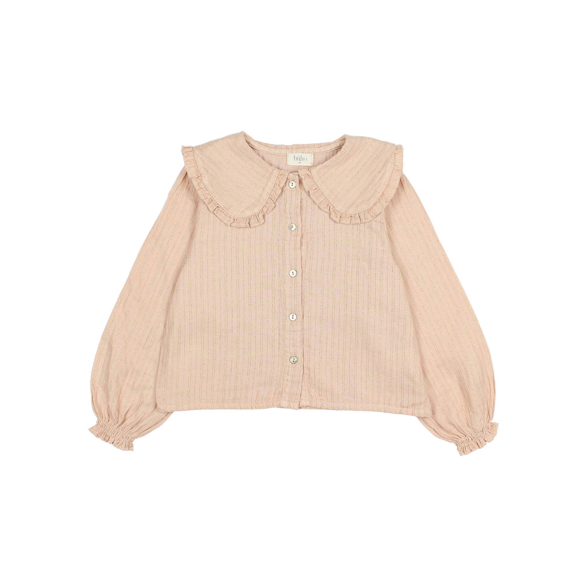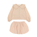 Collared blouse with ruffled edge paired with the bubble hem skirt in Rose Lurex.