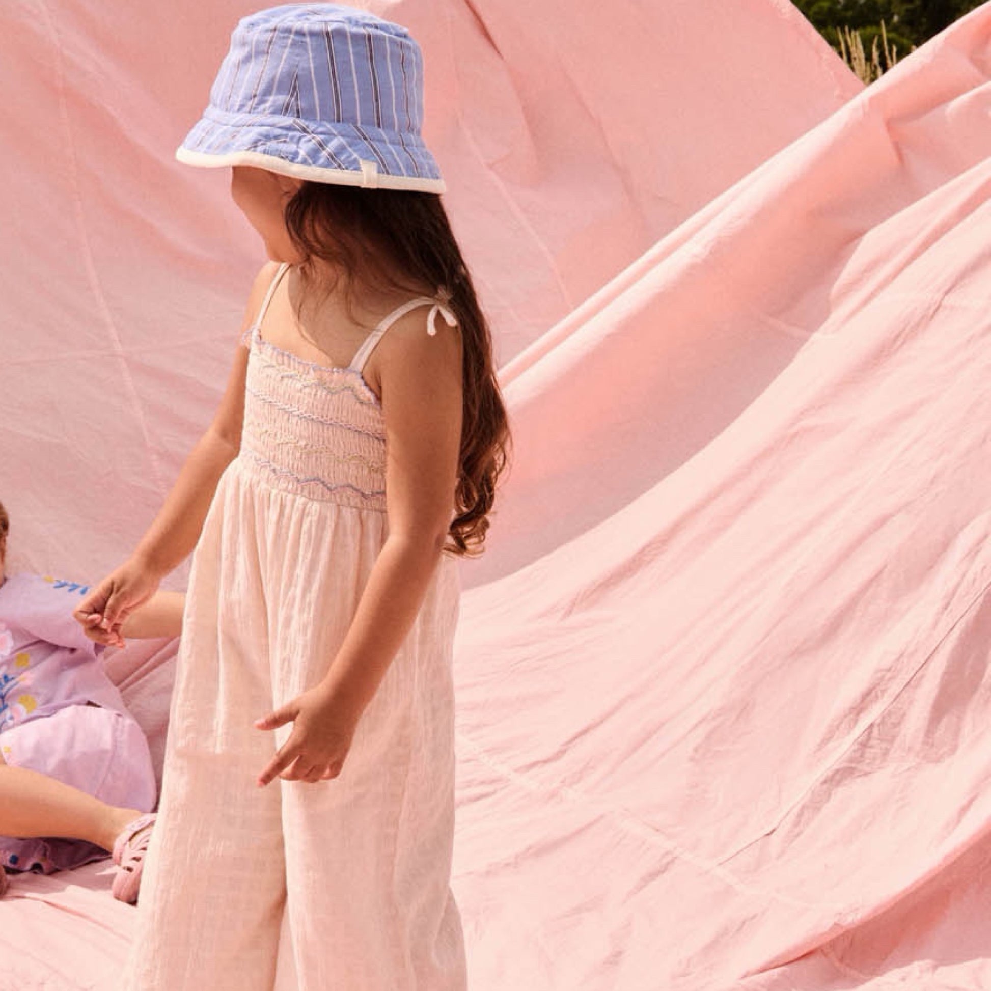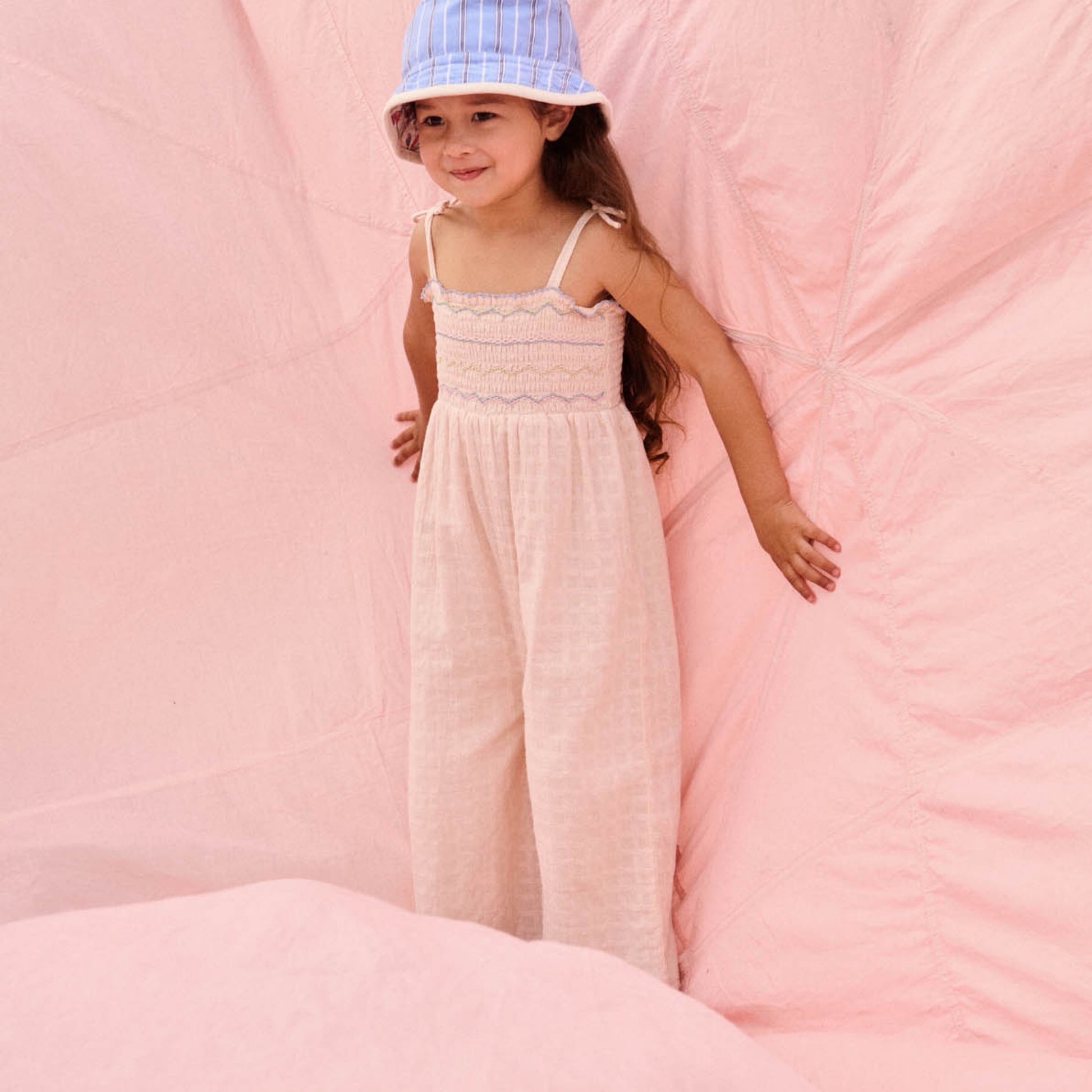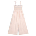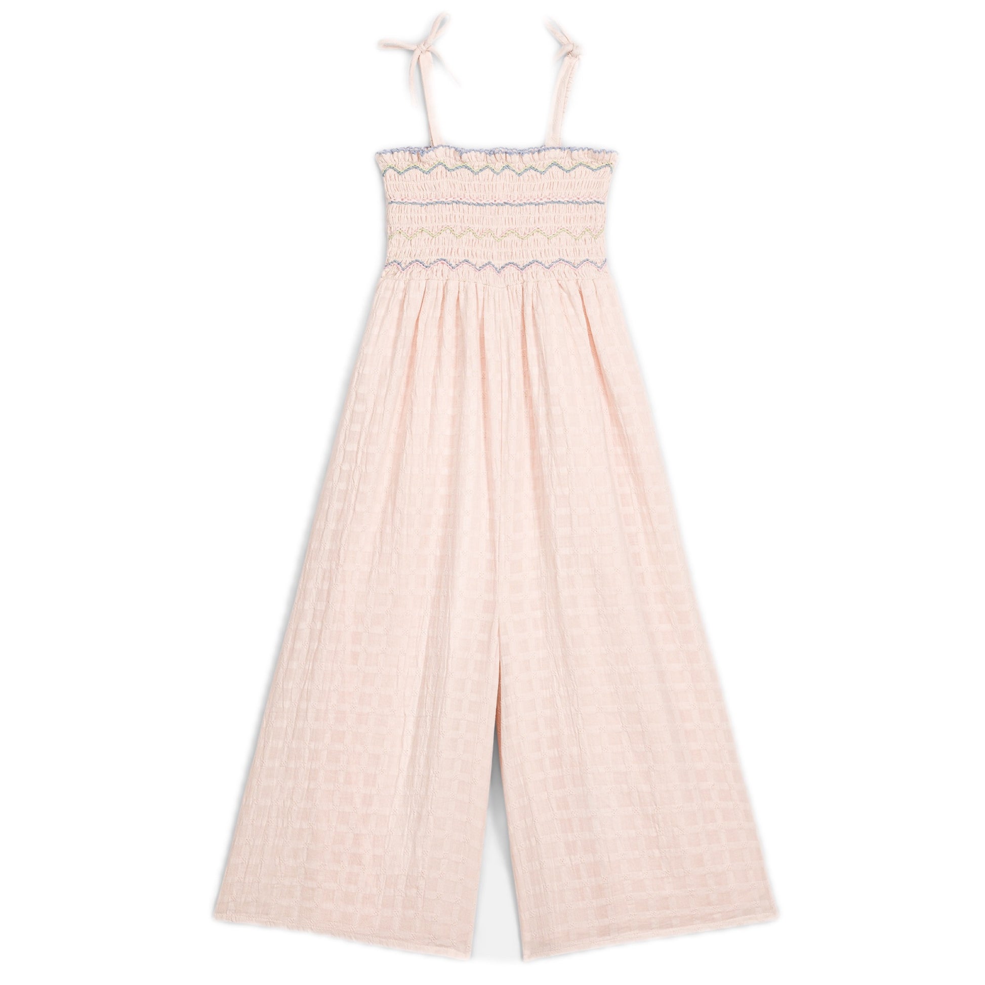 Cotton jumpsuit in a blush pink textured cotton, with a hand smocked yoke, elasticized straps with bow detail and a wide leg pant.