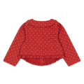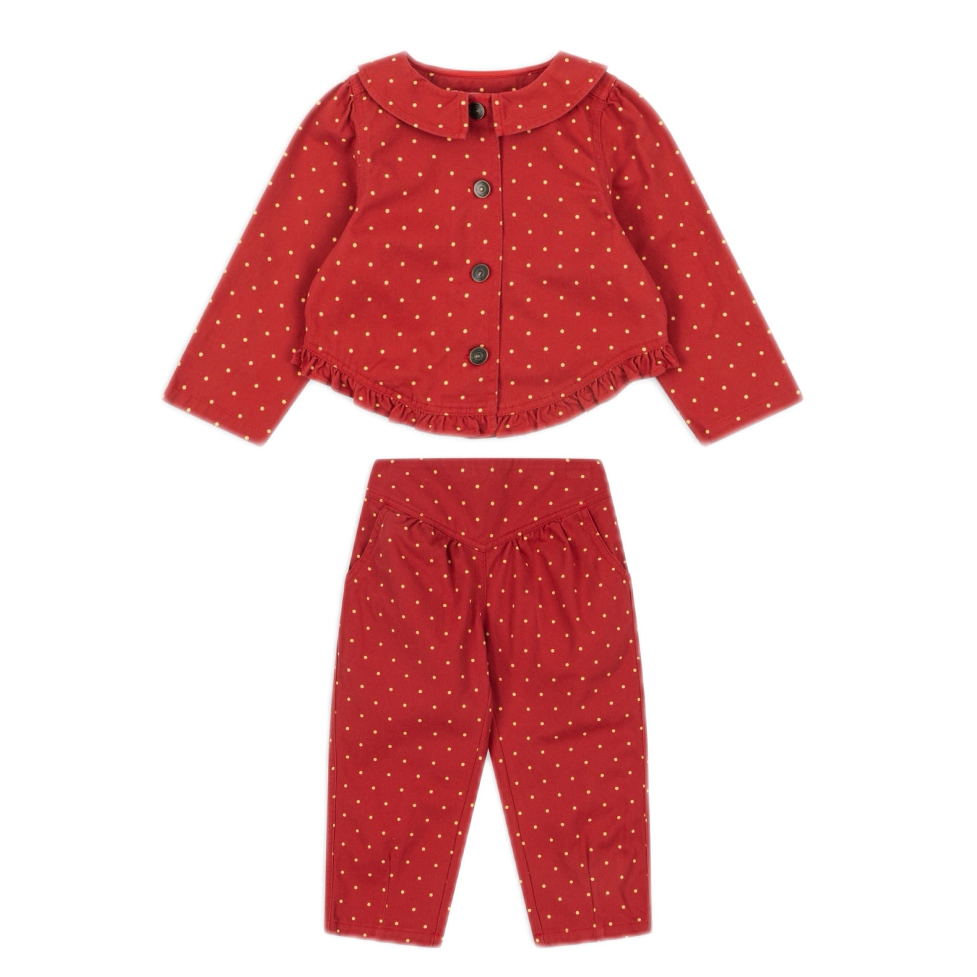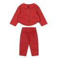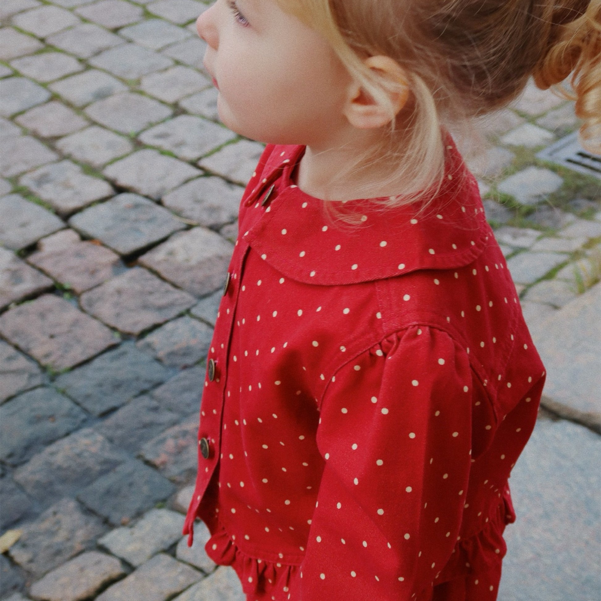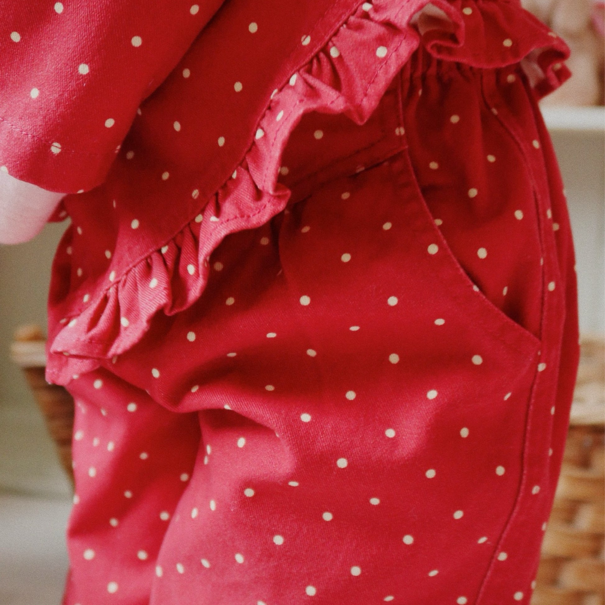 Vintage inspired denim set in Strawberry Dot features a v-panel pant with elastic back paired with a collared jacket with ruffle detail.