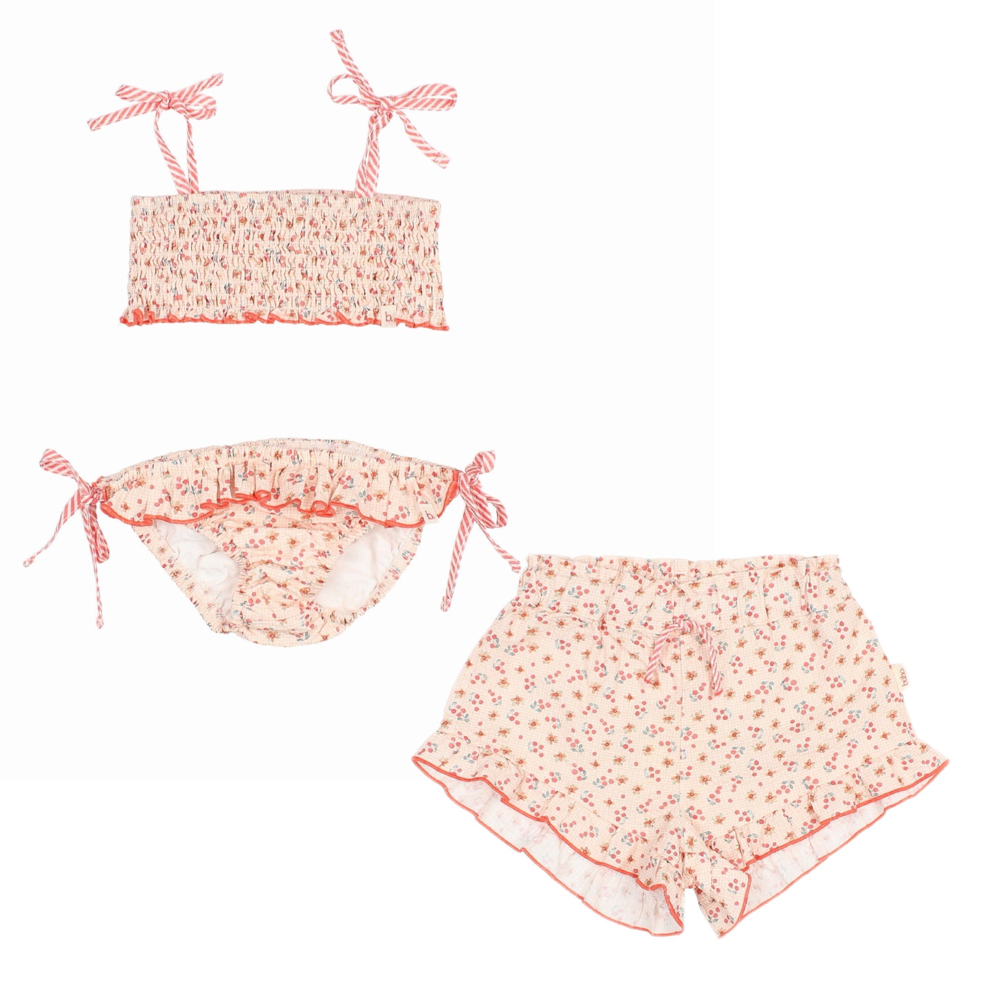Tried and true, this bikini is fabulous. RIt features a ruched top, and side tie bottoms with a sweet ruffle detail. We paired it with the matching shorts to complete this chic resort look. We recommend one size up in this set.