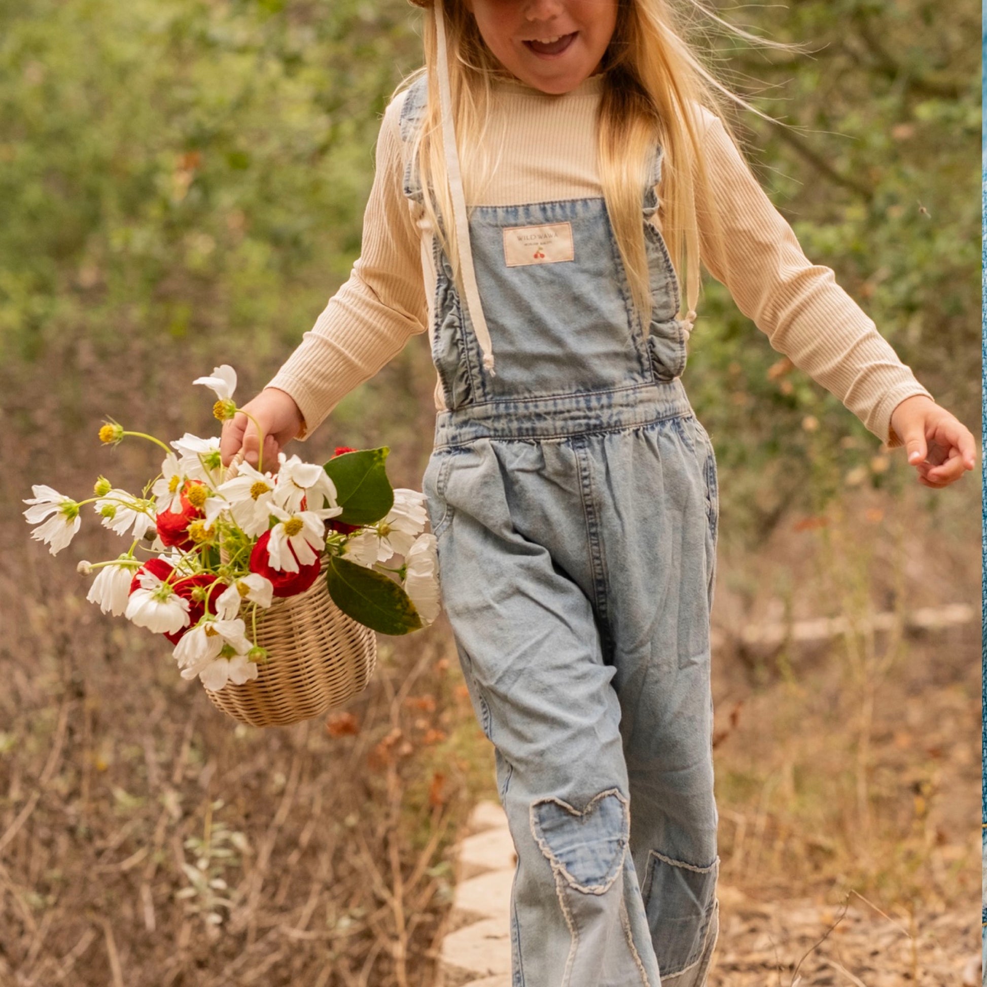 Pinafore jumpsuit in a vintage wash that feels perfectly lived-in, with handmade patch details.