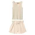 100% organic cotton Pointelle Tank and Shorts Set in Almond features overlocked edges on the tank, and an elastic, adjustable, drawstring waist for a neat, tucked in look. This is a must have elevated basic for your little one.