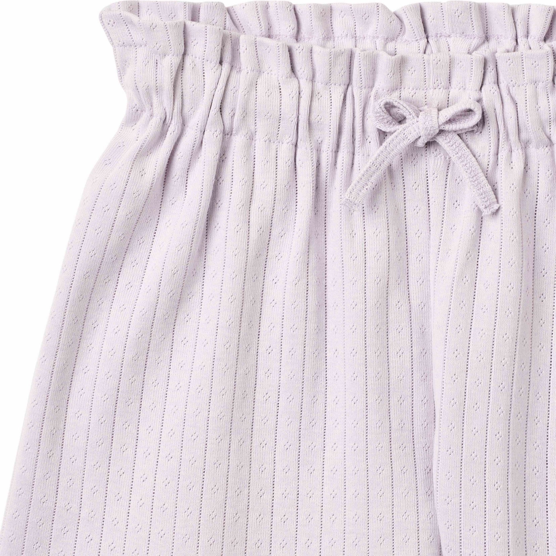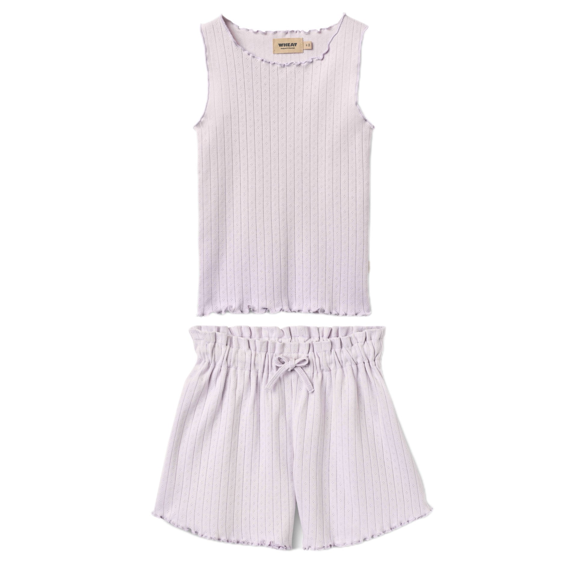 100% organic cotton Pointelle Tank and Shorts Set in Dusty Lavender features overlocked edges on the tank, and an elastic, adjustable, drawstring waist for a neat, tucked in look. This is a must have elevated basic for your little one.