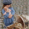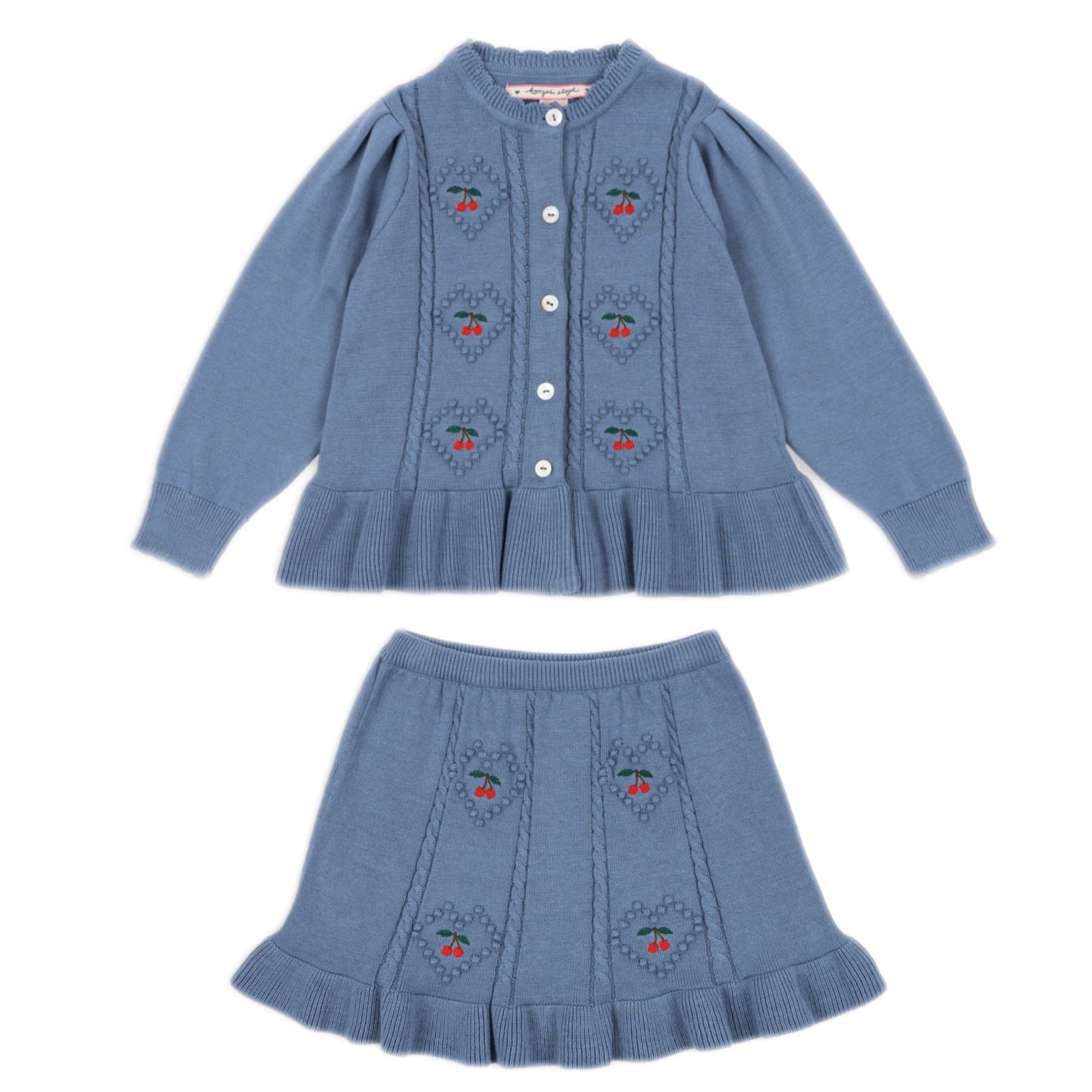 100% cotton knit skirt and cardigan set in Country Blue features embroidered cherry detail and peplum style waist.