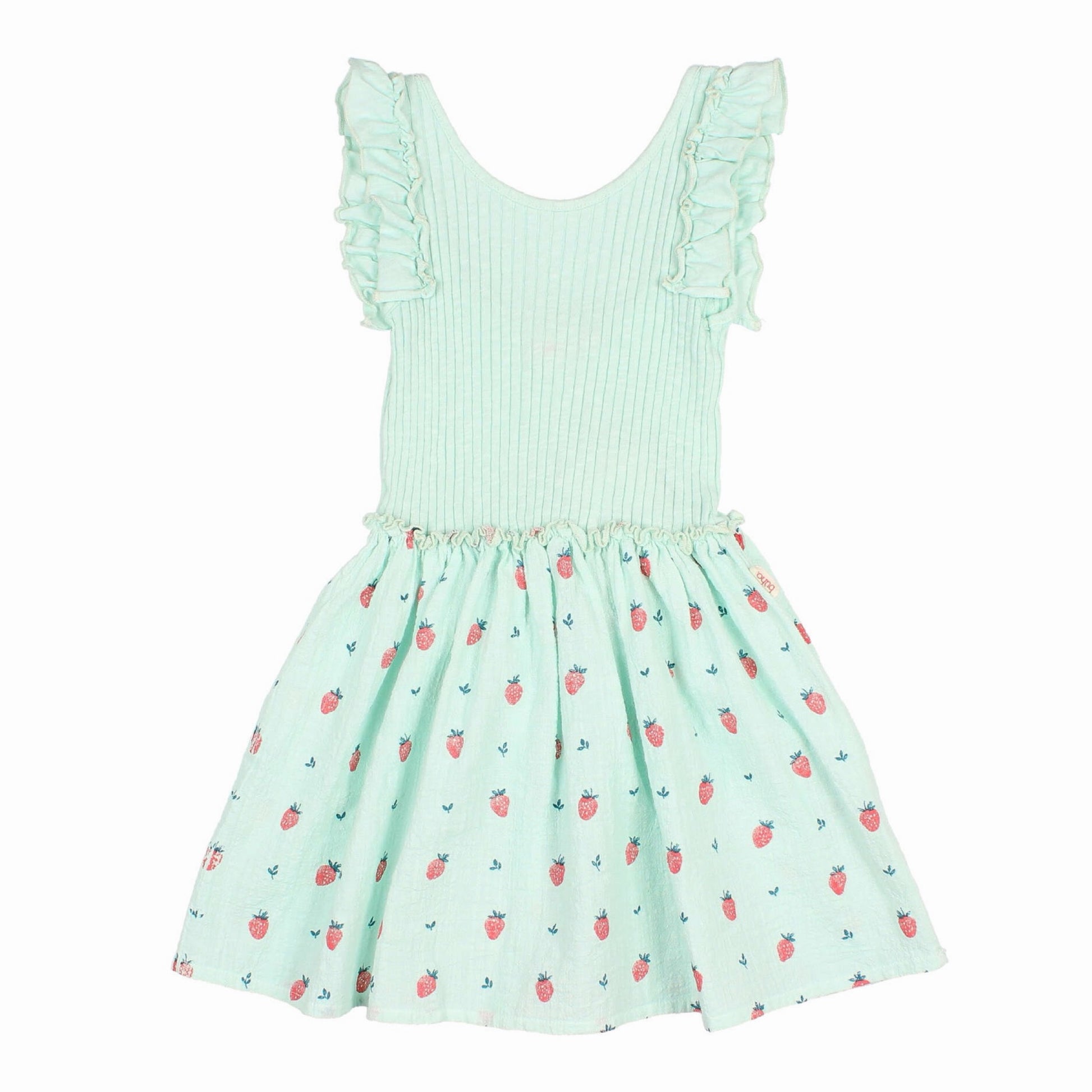 This bestseller dress comes back this year in a beautiful, fresh mint rib bodice, and mint gauze strawberry print skirted bottom. Ruffle sleeve detail and scoop back make this sweet dress irresistible.