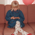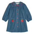 Denim swing dress with embroidered strawberries on collar and pocket, and heart buttons for that special touch she will love.