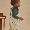 Denim overall in Mini Daisy print. Bottom snaps for easy diaper access. Pairs perfectly with the shoulder ruffle bodysuit.