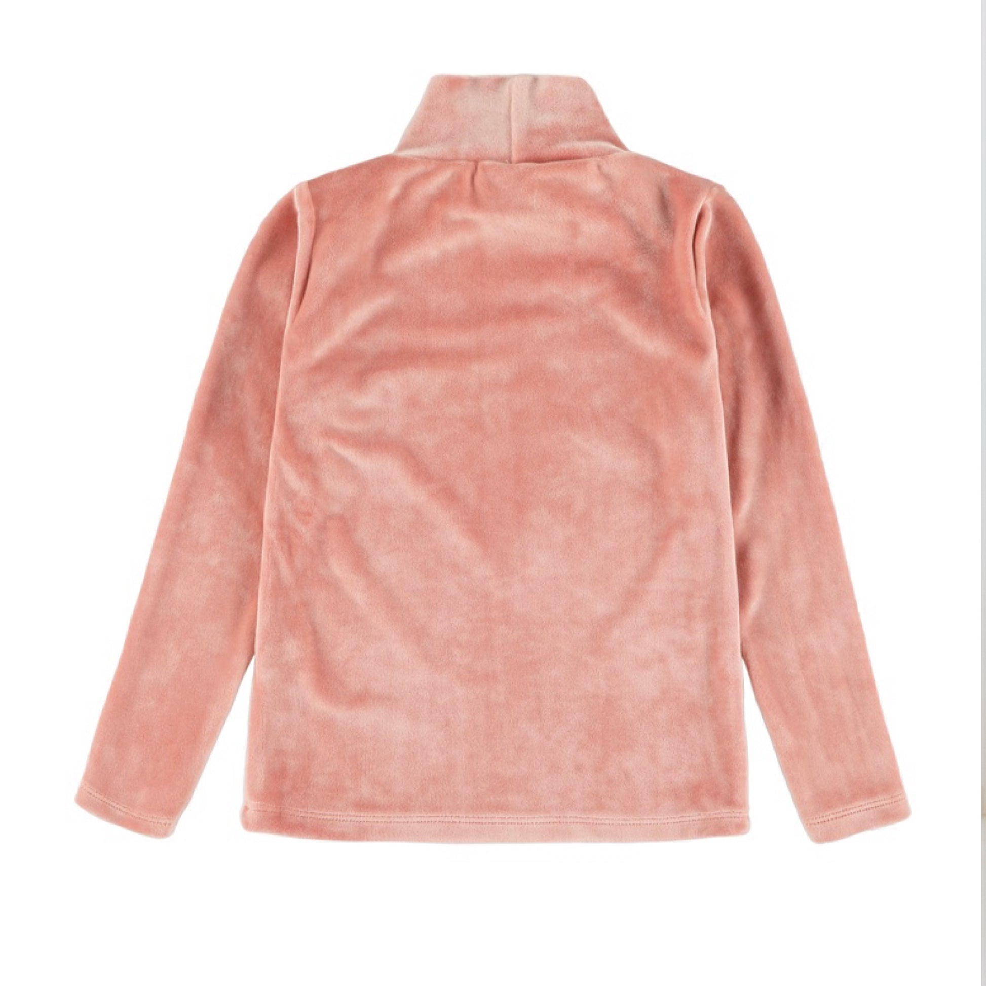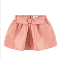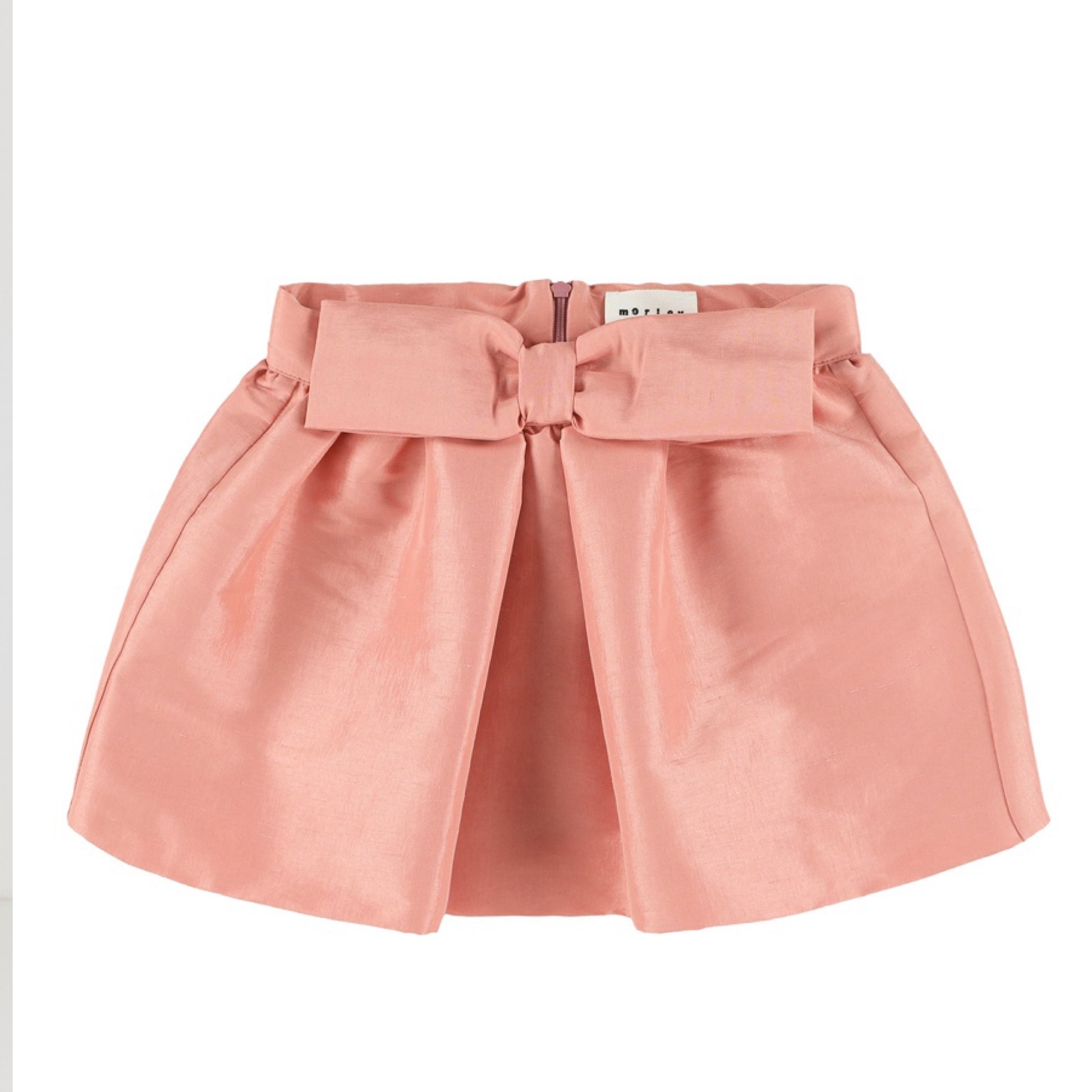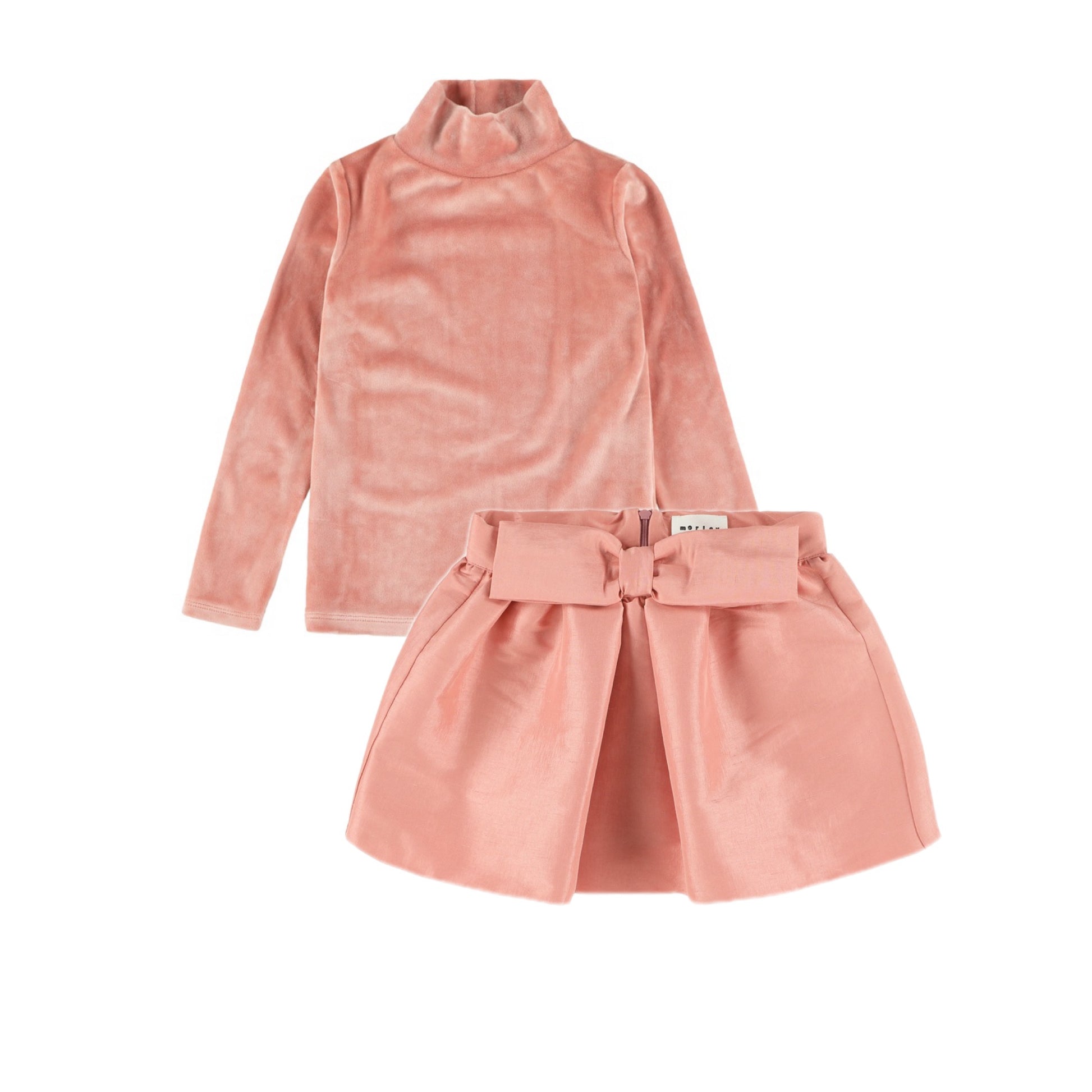 Bow front skirt with elastic waist, styled back to the velour stretch mock neck in Rose for a chic monochromatic look.