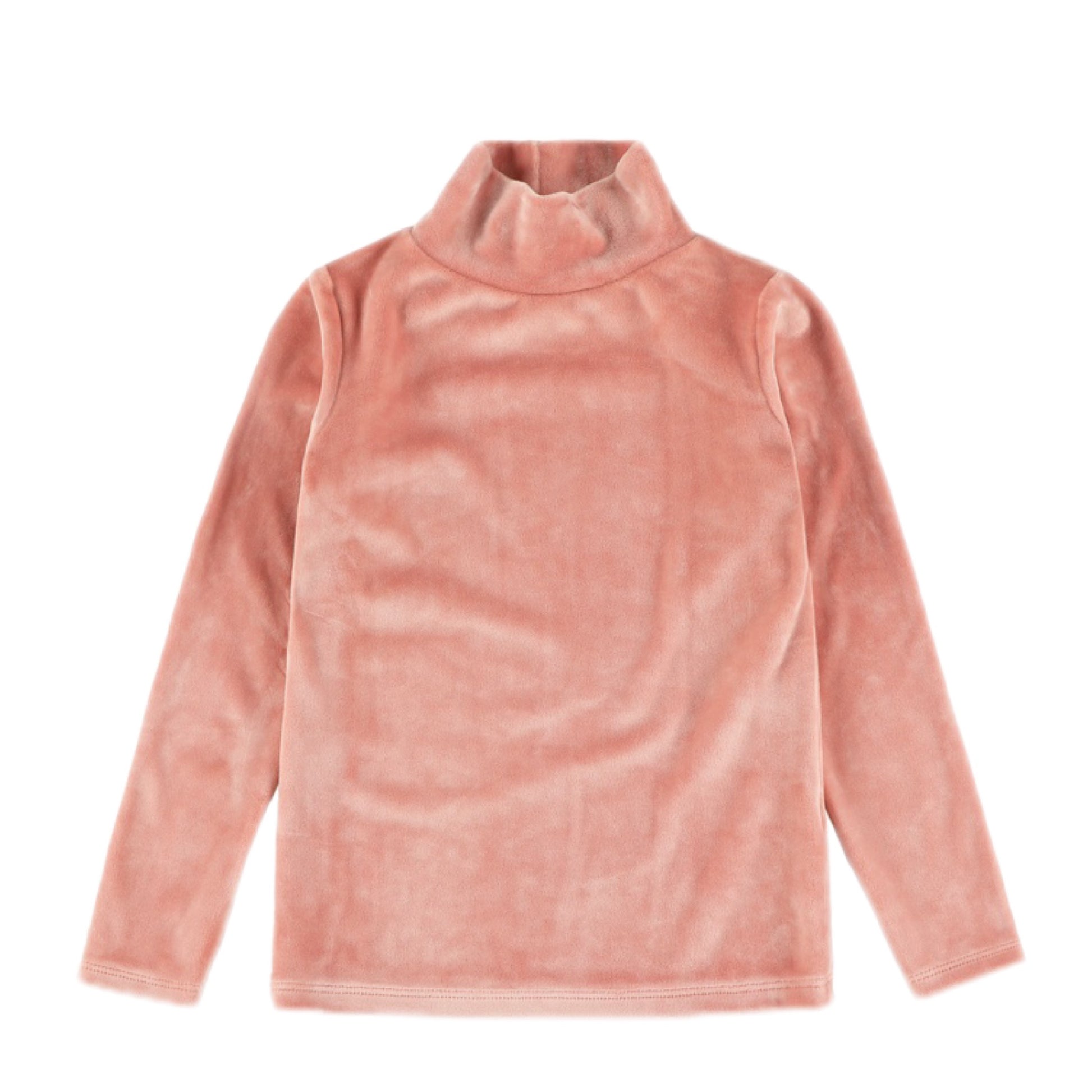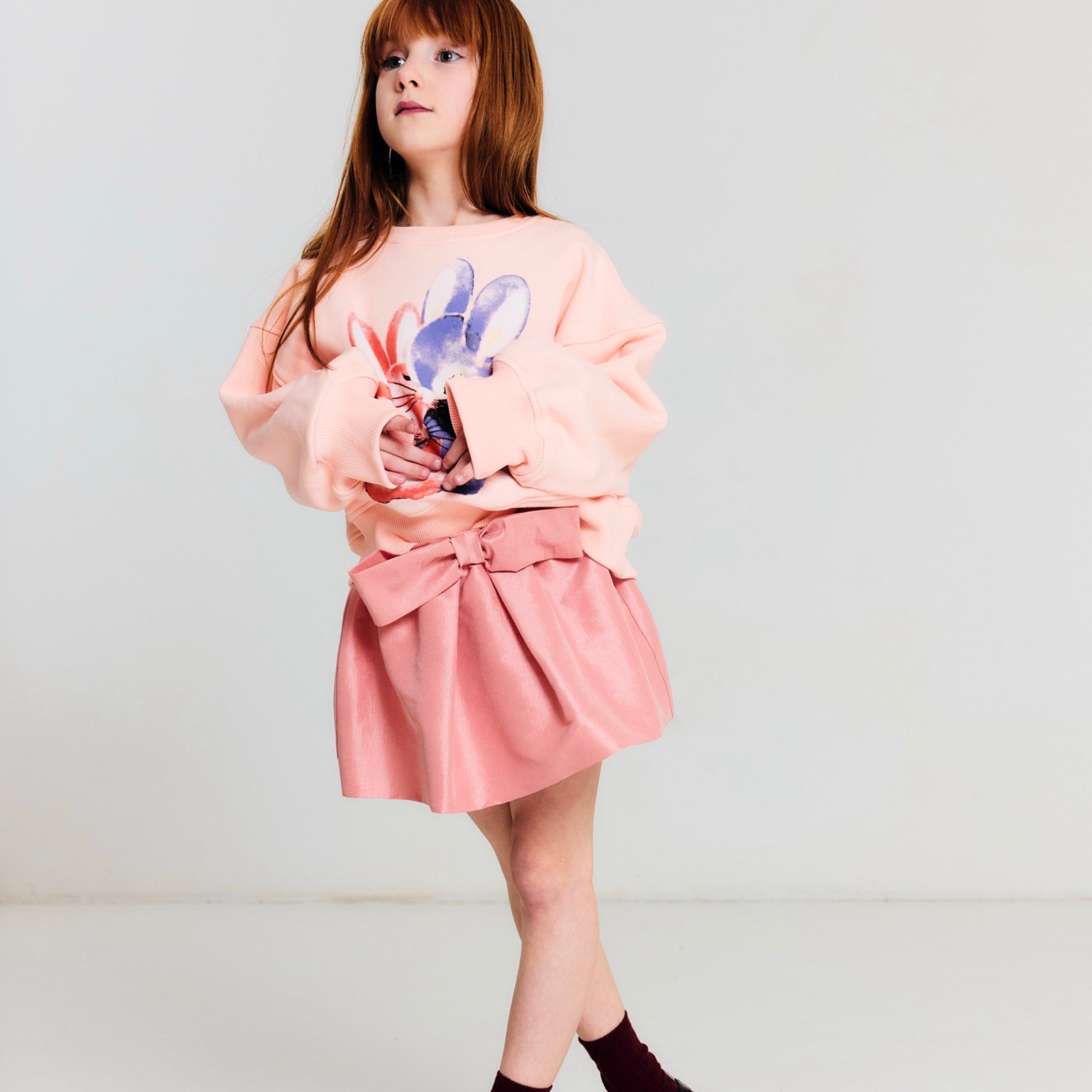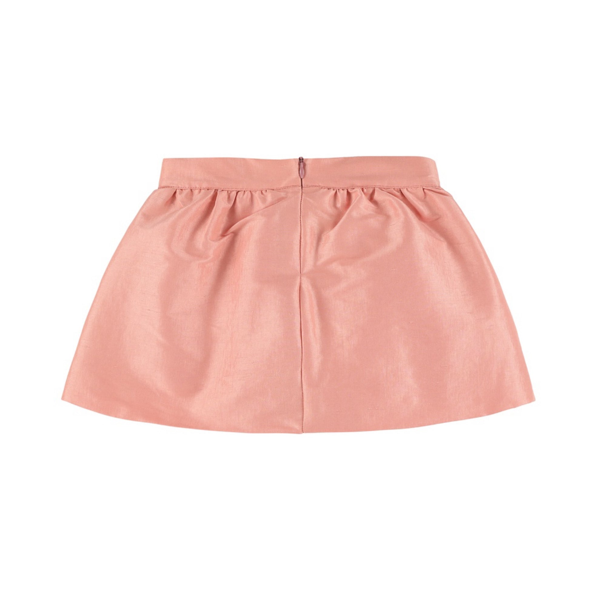 Bow front skirt with elastic waist, styled back to the velour stretch mock neck in Rose for a chic monochromatic look.