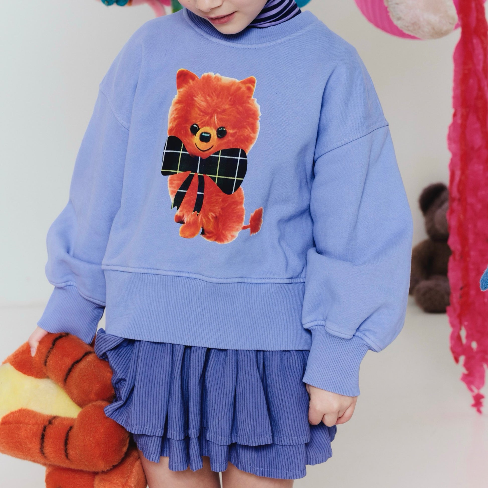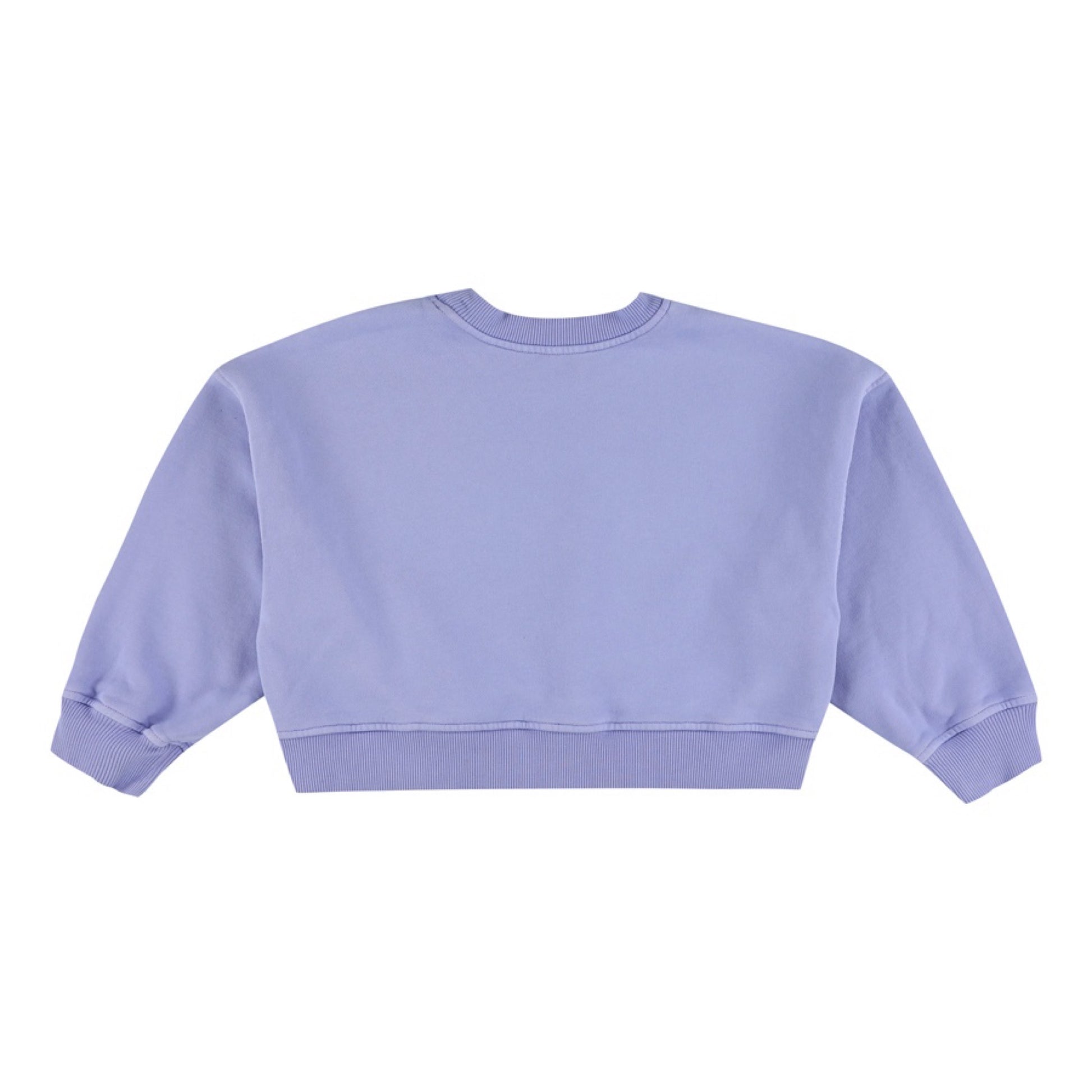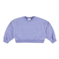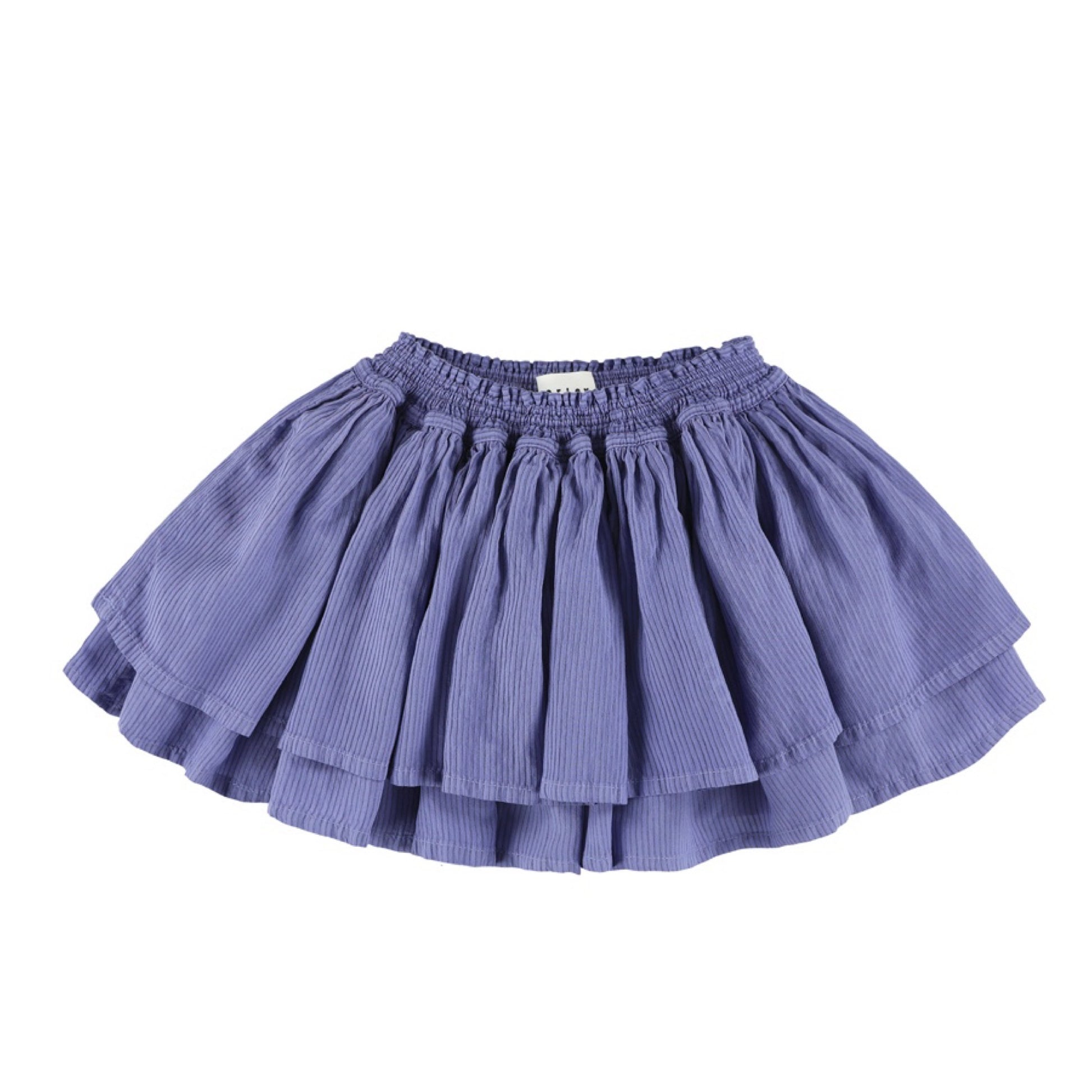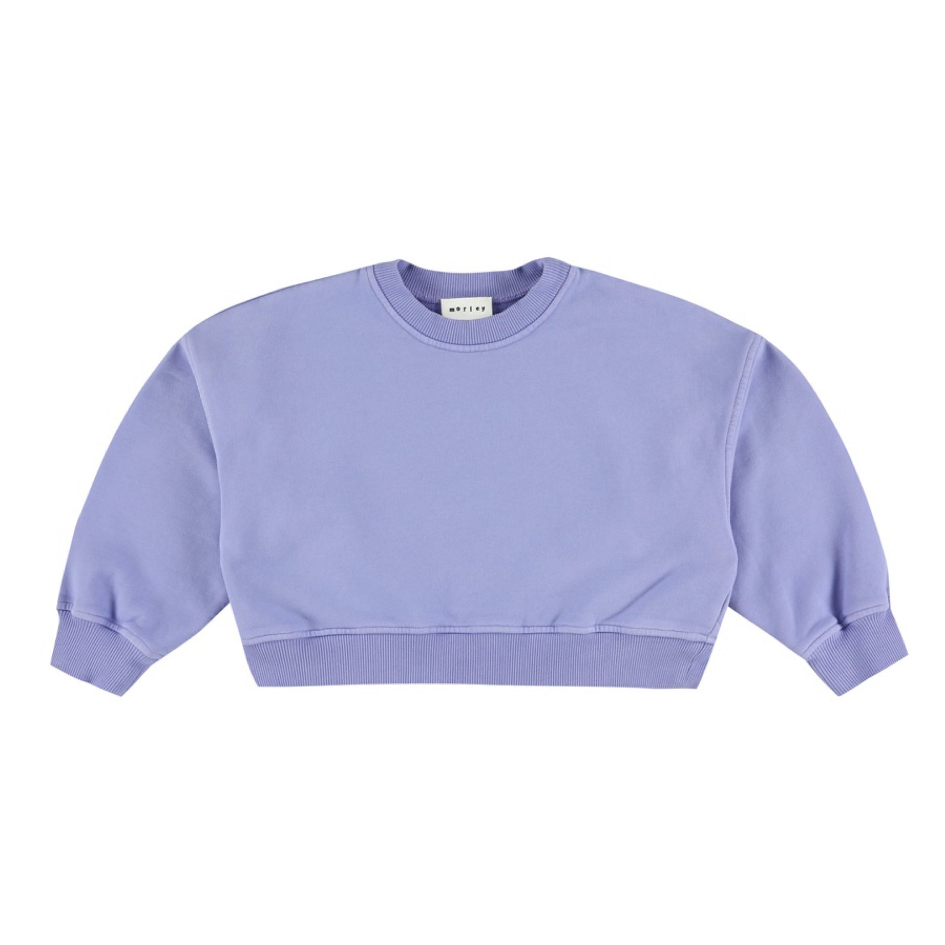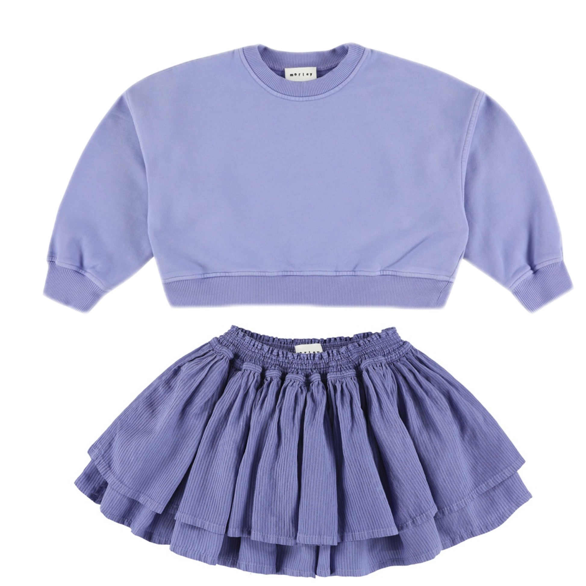 Feminine boxy fit sweatshirt in Periwinkle, styled back to the voluminous, elastic waist skirt in Periwinkle stripe